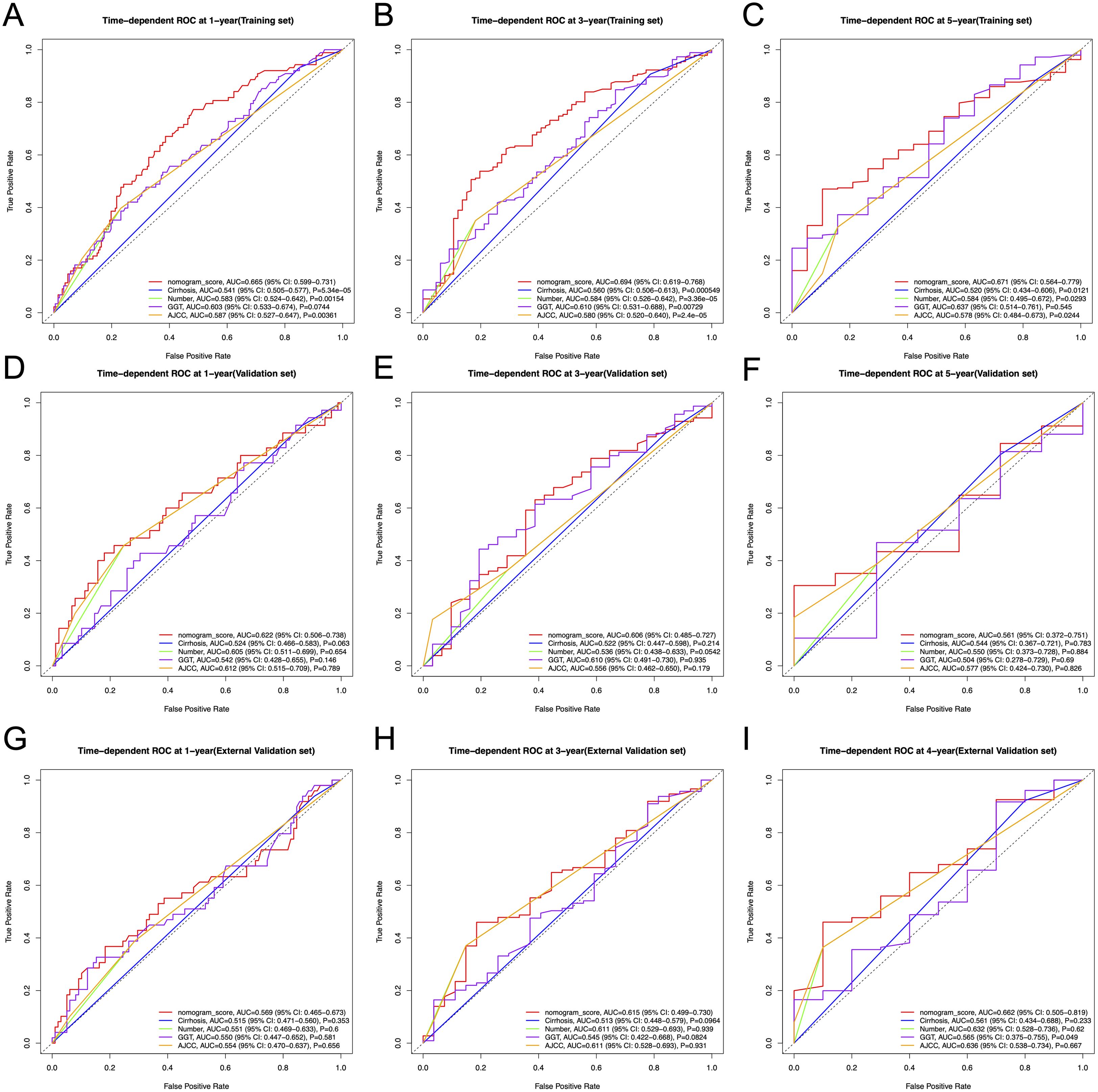 Figure 5. Time-dependent ROC curves for 1-, 3-, and 5-year RFS prediction in the training, internal validation, and external validation cohorts, comparing the nomogram with the AJCC staging system and individual predictors (cirrhosis, tumor number, and GGT). (A-C) Time-dependent ROC curves for 1-, 3- and 5-year RFS in the training cohort. (D-F) Time-dependent ROC curves for 1-, 3- and 5-year RFS in the internal validation cohort. (G-I) Time-dependent ROC curves for 1-, 3- and 4-year RFS in the external validation cohort. ROC, receiver operating characteristic curve; AUC, area under the ROC curve; RFS, recurrence-free survival; AJCC, American Joint Committee on Cancer.