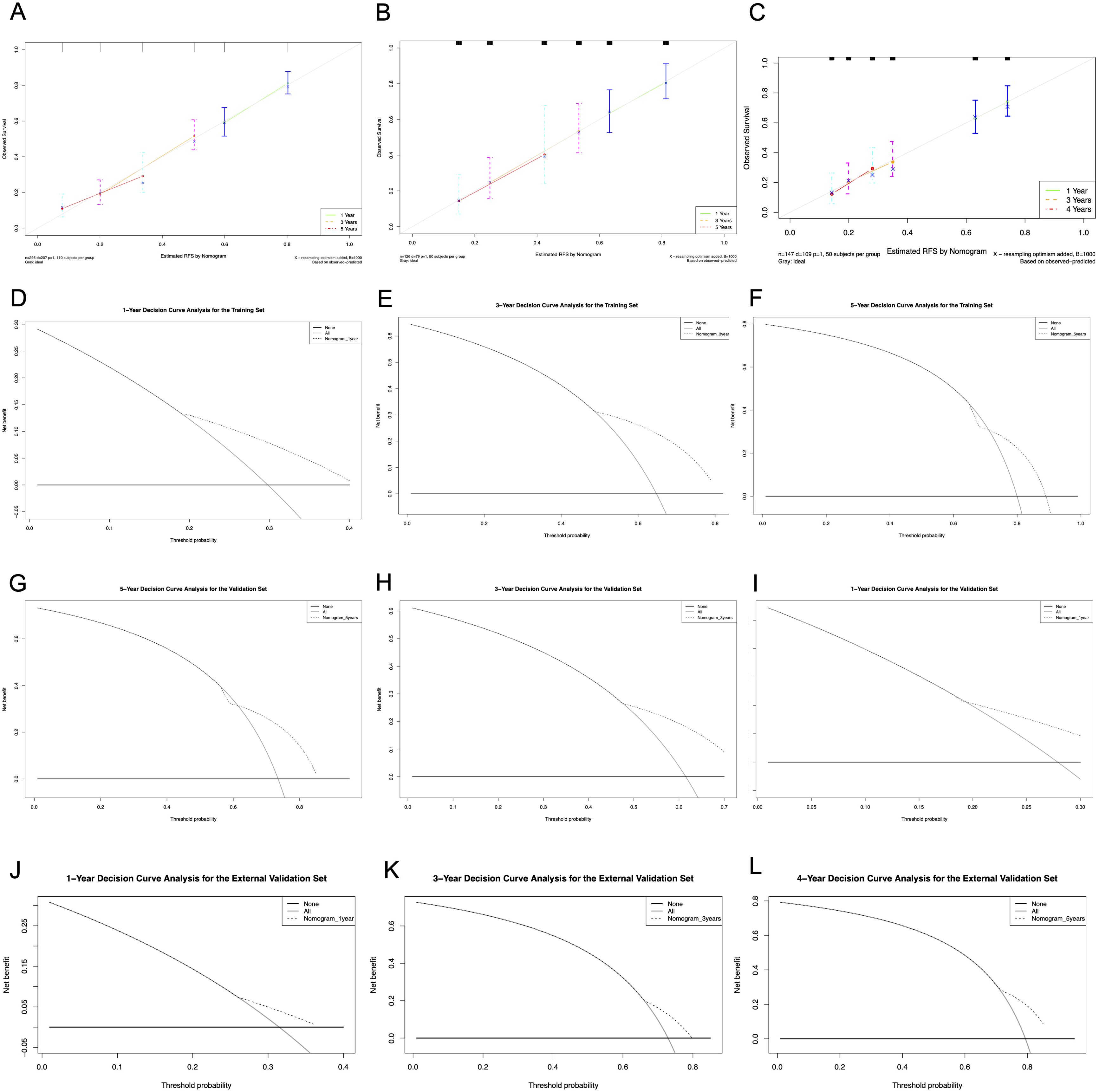 Figure 6. Calibration curves and DCA curves of the nomogram in the training and validation cohort. (A) Calibration curves of the training cohort; (B) Calibration curves of the internal validation cohort. (C) Calibration curves of the external validation cohort. (D-F) DCA for 1-, 3- and 5-year RFS in the training cohort. (G–I) DCA for 1-, 3- and 5-year RFS in the internal validation cohort. (J-L) DCA for 1-, 3- and 4-year RFS in the external validation cohort. DCA, decision curve analysis; RFS, recurrence-free survival.