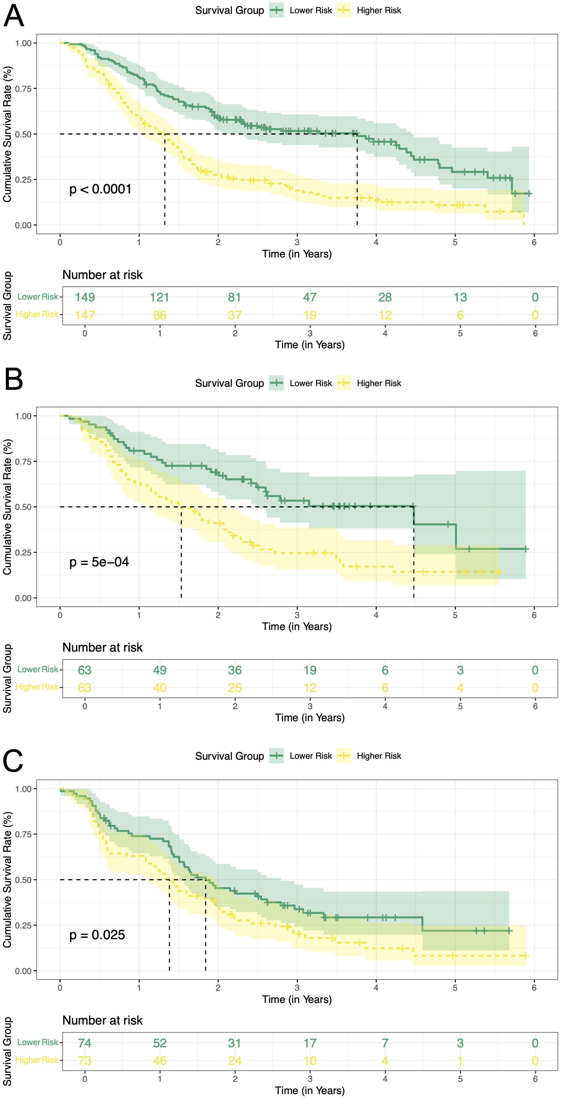 The above analyses demonstrated the good predictive effect of the nomogram. We calculated the prediction score based on the three variables in the nomogram. A median cutoff value was used to separate the patients in the training cohort into a low-risk group (n = 149) and a high-risk group (n = 147). In the training cohort, a significantly prolonged RFS have been observed in the low-risk group (3.76 years, 95% CI: 2.29-4.44) compared with the high-risk group (1.33 years, 95% CI: 1.03-1.50, P < 0.0001) (Figure 7A). Additionally, the cumulative RFS rates for low-risk patients at 1-, 3-, and 5-year were 0.81, 0.52 and 0.29, respectively, while for high-risk patients, the rates were 0.59, 0.19 and 0.11. In the internal validation cohort, there were 63 patients in each of the low-risk and high-risk groups. The low-risk group achieved a median RFS of 4.48 years (95% CI: 2.48-not reached), with 1-, 3-, and 5-year RFS rates of 0.81, 0.53 and 0.40, respectively. In contrast, the high-risk cohort displayed markedly reduced survival, registering a median RFS of 1.53 years (95% CI: 1.11-2.18, P = 5e-04). Corresponding 1-, 3-, and 5-year RFS rates were 0.63, 0.25 and 0.14, respectively (Figure 7B). External validation further corroborated this risk stratification pattern. Patients in the low-risk group had significantly longer RFS compared to patients in the high-risk group (1.84 years [95% CI: 1.51-2.79] vs. 1.38 years [95% CI: 1.13-1.97], P = 0.025) (Figure 7C). The 1-, 3-, and 5-year RFS rates were 0.74, 0.34 and 0.22 in the low-risk patients, while 0.63, 0.20 and 0.08 in the high-risk patients, respectively. All these results proved that our model can effectively distinguish the recurrence risk.