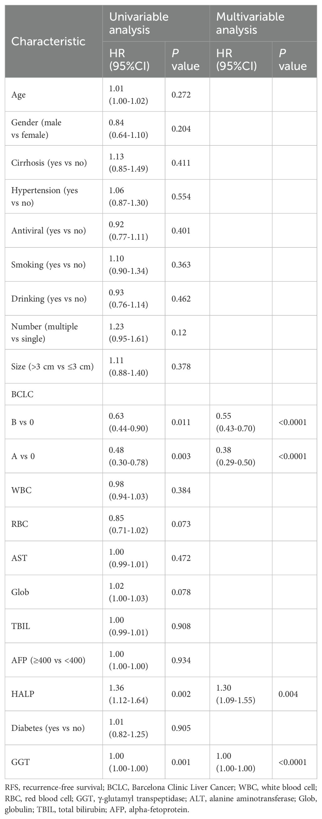 The combination of TACE and ablation has been widely adopted in clinical practice, which offers clear visualization of HCC lesions, expands the ablation zone, reduces tumor volume, and thereby enhancing the complete ablation rate (22). However, it cannot be ignored that a high recurrence rate after therapy. The HALP score, developed by Chen et al. in 2015, provides a comprehensive assessment of both nutritional and immune status (15). Recent studies have identified it as an independent predictor of RFS in pancreatic cancer and early-stage breast cancer, with lower HALP scores associated with shorter RFS (11, 23). Although the prognostic value of the HALP score has been explored in HCC patients undergoing hepatic resection (16–18), its significance in those treated with TACE and ablation remains unclear. Therefore, it is necessary to evaluate the relationship between the HALP score and recurrence in HCC patients treated with TACE and ablation.