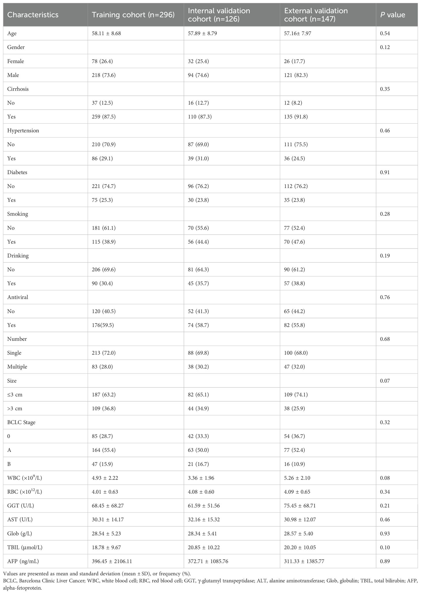 Patients in the H-HALP were randomly divided into the training cohort (n=296) and the internal validation cohort (n=126) in a 7:3 ratio. The external validation cohort consisted of 147 individuals. Baseline characteristics are summarized in Table 2. In both cohorts, the majority of patients were male (73.6% vs. 74.6% vs. 82.3%) and aged over 55 years old (58.1 ± 8.68 vs. 57.9 ± 8.79 vs. 57.16 ± 7.97). In the training cohort, 259 (87.5%) patients were diagnosed with cirrhosis, 86 (29.1%) with hypertension, and 75 (25.3%) with diabetes mellitus, respectively. In the internal validation cohort, 110 (87.3%) had cirrhosis, 39 (31.0%) had hypertension, 30 (23.8%) had diabetes mellitus. In the external validation cohort, cirrhosis was diagnosed in 135 patients (91.8%), with hypertension and diabetes affecting 36 (24.5%) and 35 (23.8%), respectively. Furthermore, more than half of the patients had received antiviral treatment (59.5% vs. 58.7% vs. 55.8%). In terms of tumor characteristics, most patients had solitary tumor (72.0% vs. 69.8% vs. 68.0%) and tumor size were less than 3cm (63.2% vs. 65.0% vs. 74.1%). Statistical analysis indicated no significant differences between the training and validation cohorts (P > 0.05).