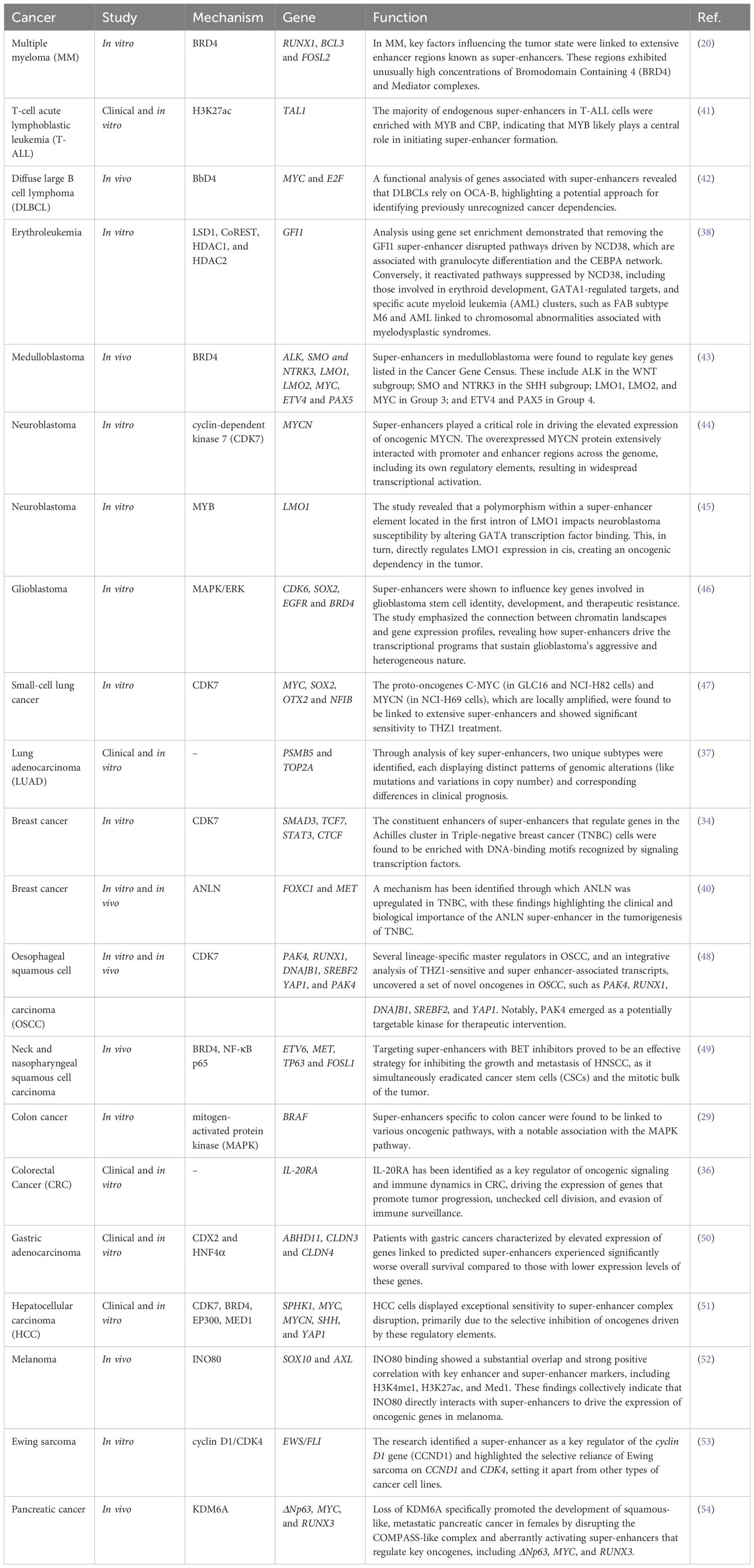In cancer, specific super-enhancers, termed oncogenic super-enhancers, emerge within tumor cells to enhance oncogene expression, leading to the dysregulation of key pathways and driving malignancy (27). Initially identified in multiple myeloma cells, oncogenic super-enhancers exhibit high binding densities of transcriptional coactivators like MED1 and BRD4 and have since been implicated in a variety of cancers (20). Recent studies have identified several oncogenic super-enhancers in cancers such as small-cell lung cancer (SCLC), neuroblastoma, esophageal cancer, colorectal cancer (CRC), and melanoma (22, 28). Oncogenic super-enhancers contribute to cancer progression through several mechanisms, including the activation of pathways like mitogen-activated protein kinase (MAPK), which inhibits apoptosis and enhances proliferation (29). Super-enhancers drive the elevated expression of the erythroblastosis virus E26 oncogene homolog (ERG), which in turn activates target genes that contribute to cancer progression (30). Oncogenic super-enhancers have been shown to upregulate the expression of genes like GJA5, CYP24A1, SLAMF7, and ETV145 (31). In adenoid cystic carcinoma, nuclear translocation of super-enhancers drives increased MYB expression, while in pheochromocytomas and paragangliomas, super-enhancers play a key role in promoting TERT expression (32). ChIP-seq evaluation of CRC indicated that transcription factor 4 (TCF4) functions as a terminal transcription factor in the Wnt pathway and is located at the c-MYC locus (33). TCF4 is a target of Wnt, exhibiting a pronounced H3K27Ac signal following the acquisition of oncogenic super-enhancers by cancer cells (33). ChIP-seq evaluation of H3K27Ac in MCF-7 cells revealed that the super-enhancer targeting the ESR1 gene, which encodes the estrogen receptor alpha (ERα) exclusively, regulates genes enriched in processes associated with ERα binding in estrogen receptor-positive breast cancer cells (34). Super-enhancers play a pivotal role in channeling oncogenic signaling pathways into gene expression programs that are critical for sustaining cancer progression (33). Certain super-enhancers are frequently identified in CRC samples (35). The assignment of super-enhancers to adjacent genes revealed a subset of genes associated with malignancy that are regulated by super-enhancers. The expression of interleukin (IL)-20 receptor alpha (RA) is dysregulated through enhancer hijacking, a mechanism involving chromosomal rearrangements that reorganize super-enhancers, leading to oncogenesis (36). Profiling of H3K27ac in lung adenocarcinoma (LUAD) cells versus normal lung tissues demonstrated the presence of cancer-specific and normal-specific super-enhancers (37). Cancer-specific super-enhancer target genes were found to be enriched in LUAD driver genes and tumor signaling pathways, whereas normal-specific super-enhancer target genes were associated with immune functions (38). The homeobox B (HOXB) cluster locus, commonly associated with super-enhancers, contains a super-enhancer present in primary CRC tissues but absent in normal colon tissues, highlighting its specificity to CRC (39). HOXB overexpression was essential for sustaining malignant phenotypes in CRC and is regulated by the super-enhancer associated with the HOXB cluster. Furthermore, multiomic profiling of the super-enhancer landscape in triple-negative breast cancer demonstrated that cells within the same subtype exhibited a greater degree of super-enhancer similarity (40). Specific side effects of triple-negative breast cancer are linked to various oncogenes such as MET, FOXC1, and MYC (40). Taken together, these findings underscore the critical role of oncogenic super-enhancers in shaping cancer phenotypes and driving malignancy (Table 1).