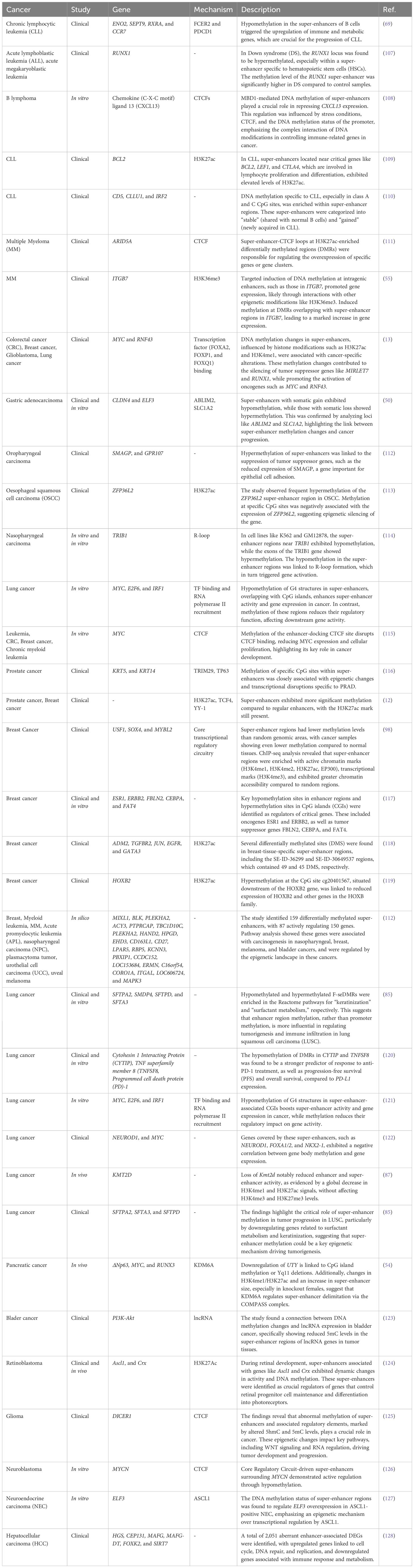 The epigenetic regulation of super-enhancers, particularly DNA methylation, plays a pivotal role in controlling their activity. Aberrant DNA methylation patterns in super-enhancers contribute to oncogenesis by modulating the expression of oncogenes, tumor suppressors, and immune-regulatory genes. In this section, we summarize the findings of super-enhancer DNA methylation in cancer (Table 2).