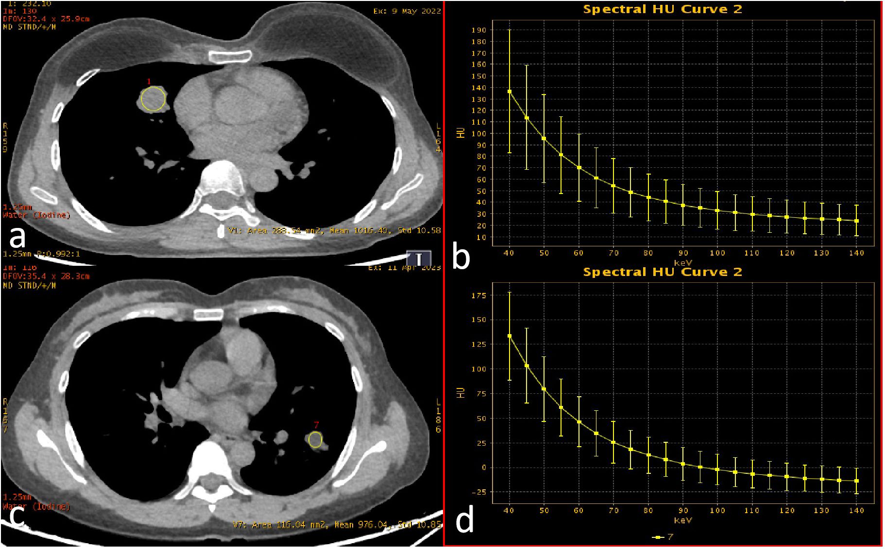 Figure 1. Spectral enhancement image with ROI delineation and spectral curves. ROIs were placed at the largest cross-sectional dimension of the tumor, encompassing the majority of solid components within the lesion. (a, b) EGFR wild-type (female, 45 years old; λHU = 1.59); (c, d) EGFR mutation-positive (female, 50 years old; λHU = 2.21).