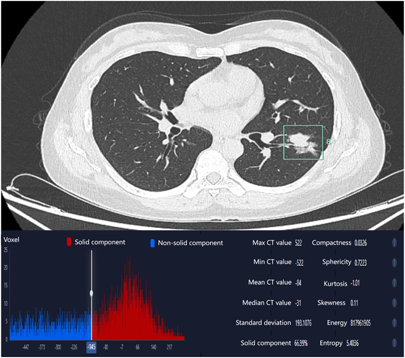 Figure 2. AI-derived CT histogram parameters. The solid component percentage was defined as the total number of voxels with CT attenuation ≥ -145 Hounsfield Units (representing the solid component) divided by the total number of voxels encompassing the entire tumor.