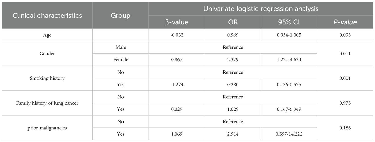 A total of 150 lung adenocarcinoma patients were enrolled based on the inclusion and exclusion criteria, comprising 89 EGFR-mutant cases and 61 wild-type cases, with 72 males and 78 females (mean age 60.02 ± 9.15 years). Comparative analysis between the EGFR-mutant and wild-type groups revealed no statistically significant differences in age (P = 0.092), family history of lung cancer (P = 1.000), or previous cancer history (P = 0.202). However, statistically significant differences were observed in gender distribution (P = 0.013) and smoking history (P = 0.001) between the two groups (Table 1).