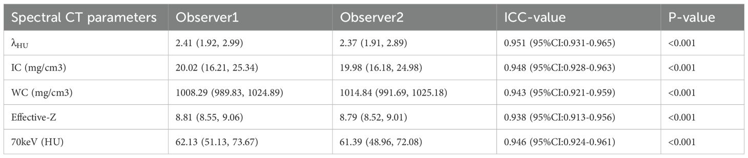 The measurement results of λHU, IC, WC, Effective-Z, and CT values at 70 keV by the two radiologists are shown in Table 2. The consistency of the data was good (ICC > 0.90).
