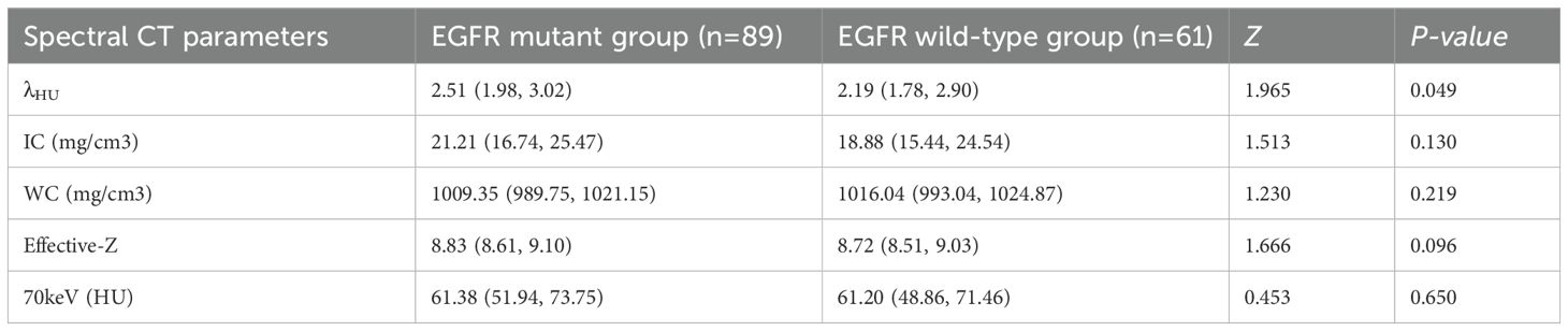 The EGFR-mutant group demonstrated significantly higher λHU values compared to the wild-type group (P = 0.049). However, no statistically significant differences were observed between the two groups in iodine concentration (P = 0.130), water concentration (P = 0.219), Effective-Z (P = 0.096), or 70 keV monochromatic imaging parameters (P = 0.650) (Table 3).