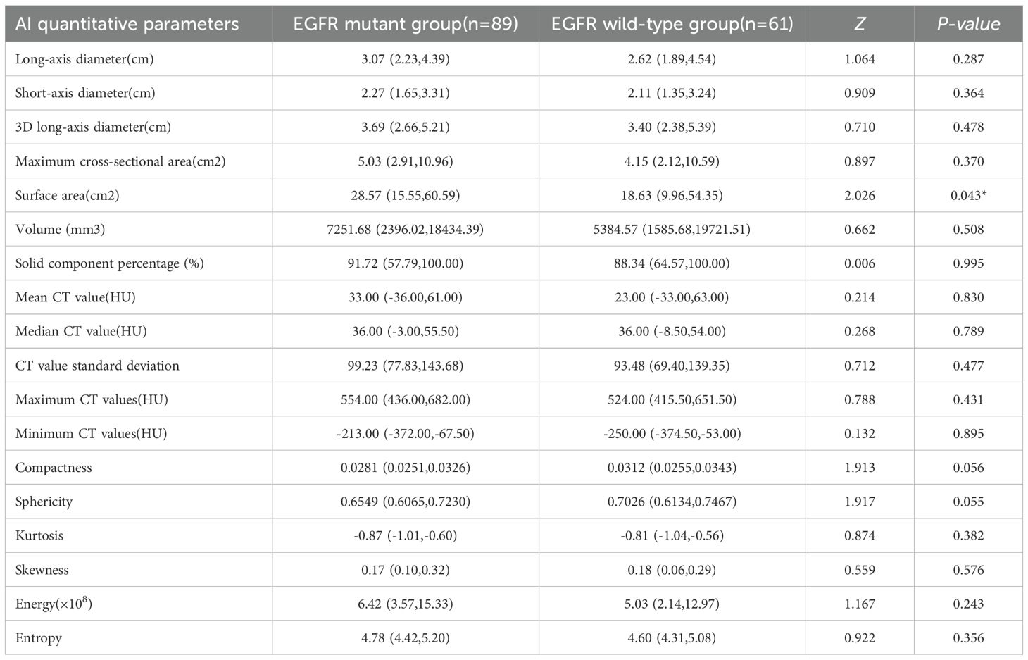 EGFR promotes vascular endothelial cell proliferation, endowing tumor tissues with abundant blood supply and facilitating rapid tumor cell proliferation. Consequently, tumor burden correlates closely with tumor size, where larger dimensions typically indicate higher invasiveness. However, conflicting evidence from several studies (27–30) suggests that EGFR-mutant lung adenocarcinomas may exhibit smaller diameters compared to wild-type counterparts. This raises uncertainty regarding the reliability of tumor diameter as a predictor of EGFR mutation status. A critical limitation of conventional size measurement lies in its exclusive focus on the maximum cross-sectional diameter, neglecting multidimensional tumor characteristics. To address this, the present study employed an artificial intelligence (AI)-assisted diagnostic system to automatically identify tumors and perform integrated classification. This system generates multiple AI-quantified parameters, capturing not only one-dimensional (long-axis and short-axis diameters) and two-dimensional (area) metrics but also three-dimensional volumetric data, thereby overcoming the limitations of manual visual assessment. In univariate analysis, tumor surface area was significantly greater in the EGFR mutation group than in the wild-type group (P = 0.043), while other AI-derived parameters showed no statistical significance. Multivariate analysis further confirmed tumor surface area as an independent predictive factor for EGFR mutations. From a histopathological perspective, the EGFR gene mediates vascular endothelial cell growth and promotes neovascularization, thereby facilitating rapid aggressive tumor progression. During this process, tumor cells within the lesion demonstrate asynchronous growth rates in different directions, leading to varying degrees of fibrotic contraction and progressive infiltration into surrounding tissues. Consequently, highly aggressive tumors tend to develop characteristic spiculation and lobulation on their surfaces (28, 31). When tumors exhibit prominent spiculation and lobulation, this morphological alteration significantly increases the overall tumor surface area.