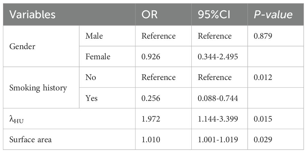Variables demonstrating statistical significance in univariate analysis, including sex, smoking history, λHU, and tumor surface area, were subsequently subjected to multicollinearity evaluation. Linear regression confirmed variance inflation factors (VIF) of 1.999, 1.999, 1.336, and 1.319 for these variables, respectively, demonstrating the absence of significant collinearity or multicollinearity (VIF<2 threshold), thus warranting their inclusion in the multivariate regression model. The analysis identified smoking history (P = 0.012), λHU (P = 0.015), and tumor surface area (P = 0.029) as independent predictors of EGFR mutations, retaining statistical significance in the final model (Table 5).