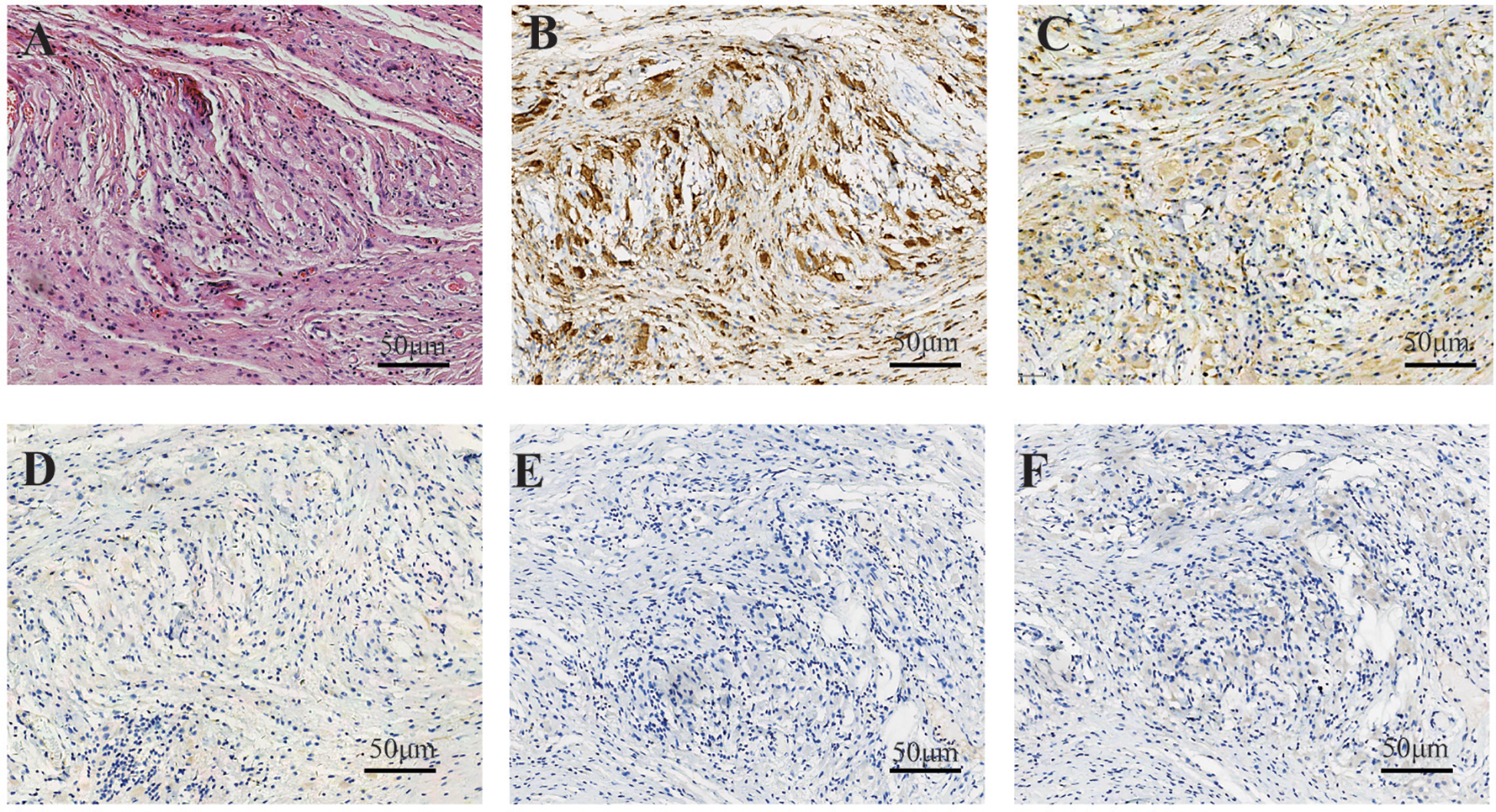 In case 1, the fibrous tissue demonstrated an infiltrate of bland-appearing histiocytes characterized by abundant foamy cytoplasm, accompanied by scattered lymphocytes (A). Immunohistochemical staining showed strong positive cytoplasmic staining for CD168 in histiocytes (B) and moderate staining for CD38 (C). Immunohistochemical staining showed that the tissue cells were negative for CD1a (D), Langerin (E), and BRAF (F).