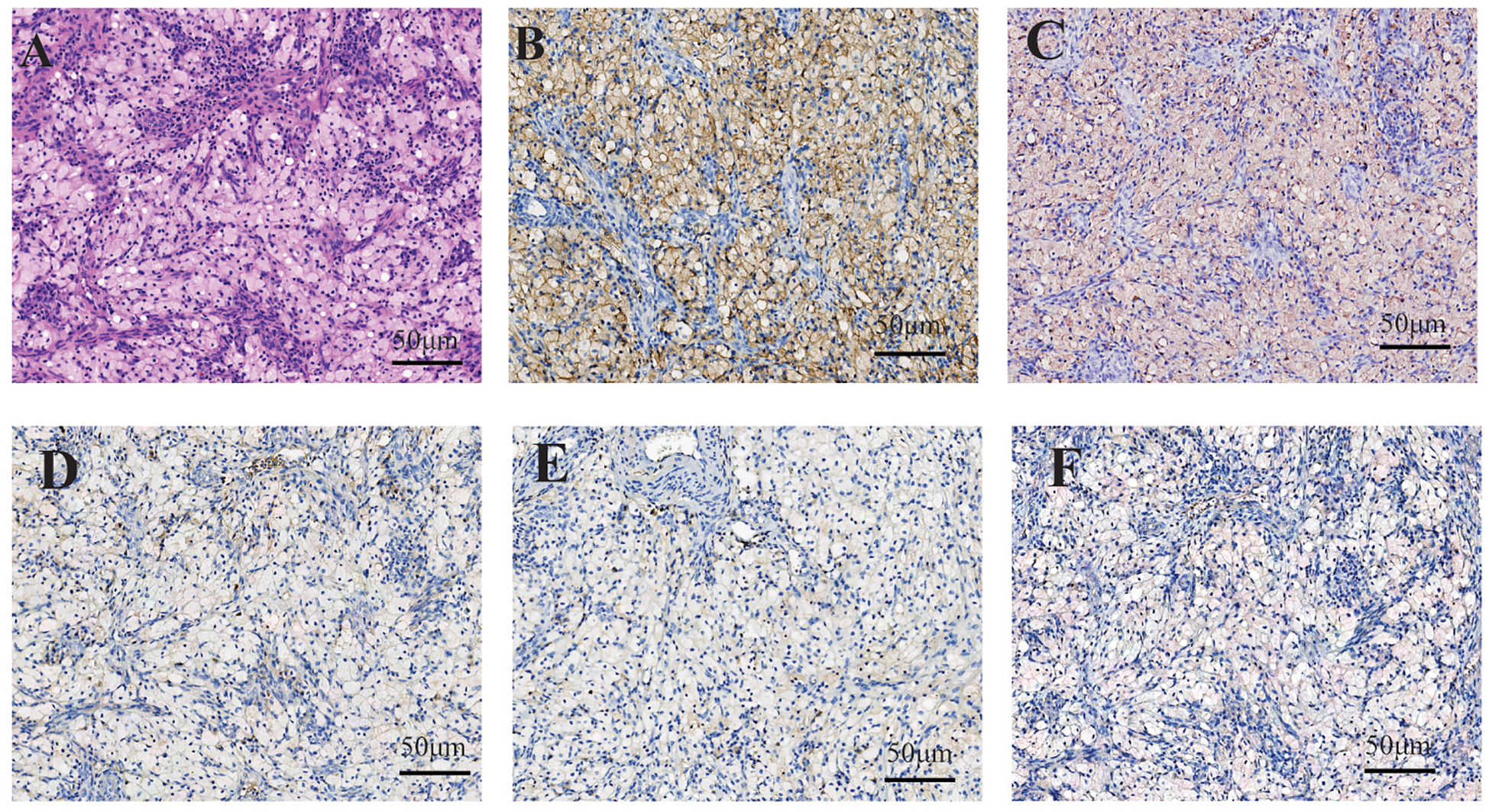 In case 2, within regions of histiocyte aggregation, hyperplasia of small blood vessels and scattered lymphocytic infiltration were observed. The histiocytes exhibited clear cytoplasm, small nuclei, and distinct cell boundaries (A). Immunohistochemical staining demonstrated cytoplasmic positivity for CD168 (B) and CD38 (C) in histiocytes, whereas staining for CD1a (D), Langerin (E) and BRAF (F) were negative.