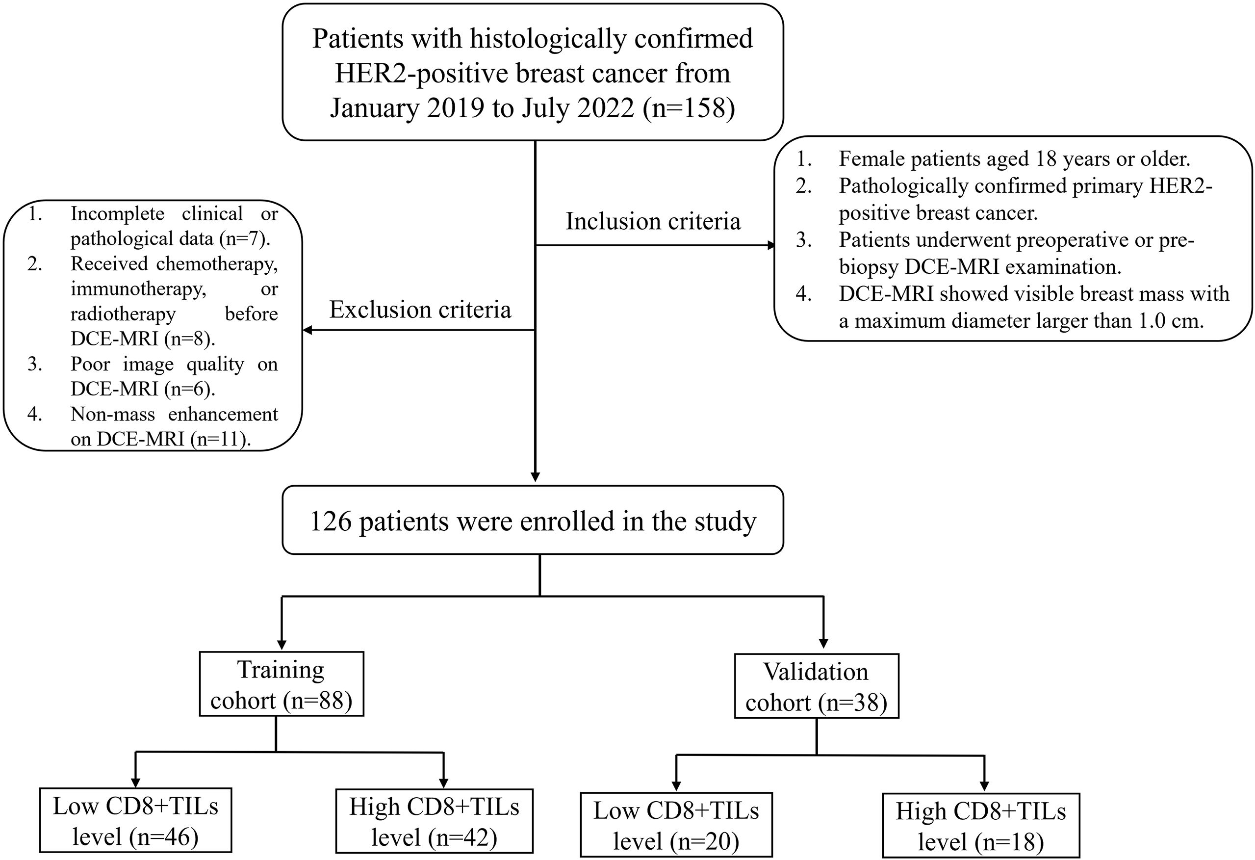 This retrospective study was approved by the Ethics Committee of Daping Hospital [Approval No: 2023 (06)]. The clinical and imaging data of 158 BC patients with histologically confirmed HER2-positive from January 2019 to July 2022 were retrospectively collected, and 126 patients who met inclusion and exclusion criteria were enrolled in this study. The inclusion criteria included: (1) Female patients aged 18 years or older; (2) Pathologically confirmed primary HER2-positive breast cancer; (3) Patients underwent preoperative or pre-biopsy DCE-MRI examination; (4) DCE-MRI showed visible breast mass with a maximum diameter larger than 1.0 cm. The exclusion criteria included: (1) Incomplete clinical or pathological data; (2) Received chemotherapy, immunotherapy, or radiotherapy before DCE-MRI; (3) Poor image quality on DCE-MRI; (4) Non-mass enhancement on DCE-MRI. Patients were randomly divided into a training cohort (n=88) and a validation cohort (n = 38) in a ratio of 7:3. The flow chart was shown in Figure 1.