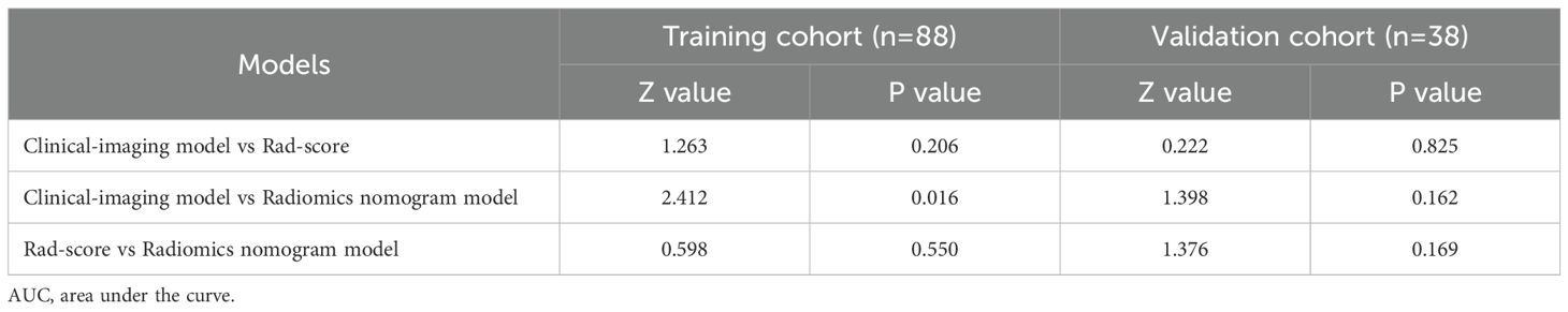 Statistical analysis was performed using SPSS and R software. The normality and homogeneity of variance of the data were evaluated using the Kolmogorov-Smirnov test and Levene’s test. Normally distributed continuous data were presented as mean ± standard deviation (SD), while non-normally distributed data were presented as median (interquartile range). Independent sample t-tests or Mann-Whitney U tests were used for intergroup comparisons. Categorical data were presented as frequencies and percentages, and intergroup comparisons were performed using the chi-square test or Fisher’s exact test. The receiver operating characteristic (ROC) curve was plotted using Medcalc 20.0, and the area under the curve (AUC), sensitivity, specificity, and accuracy were calculated to evaluate model’s performance. Delong test was used to compare the AUC differences among different models. ICCs were calculated using the “psych” package, calibration plots were performed using the “rms” package, and decision curve analysis (DCA) was performed using the “devtools” package. p<0.05 was considered statistically significant.
