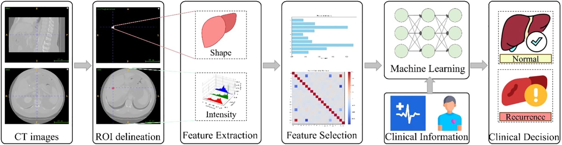 This study aimed to develop and validate a predictive model that integrates radiomics features with machine learning algorithms to forecast intrahepatic recurrence within one year after surgery in patients with colorectal cancer liver metastases. We utilized CT radiomics data combined with an expert-annotated patient dataset, extracting radiomics features from tumor regions delineated by specialists on CT images. Two models were constructed: one using only radiomics features, and another that combines radiomics features with clinical information. Fifteen machine learning algorithms were employed for feature recognition and classification, and the most effective model was identified through performance comparison. This approach aims to predict the likelihood of recurrence in patients using radiomics technology. The workflow of this study is illustrated in Figure 1.