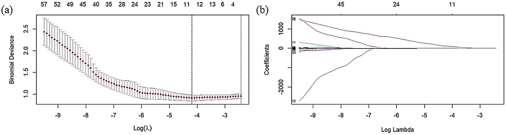 Initially, features with a significance level below 0.05 were excluded via T-tests, filtering out features significantly related to the target variable. This T-test yielded 72 features. However, some remaining features irrelevant to the machine learning models could still impact performance. Further feature refinement was conducted using LASSO regression, identifying key predictive features through 10-fold cross-validation. The cross-validation curve and regression coefficient path for LASSO are illustrated in Figure 3.