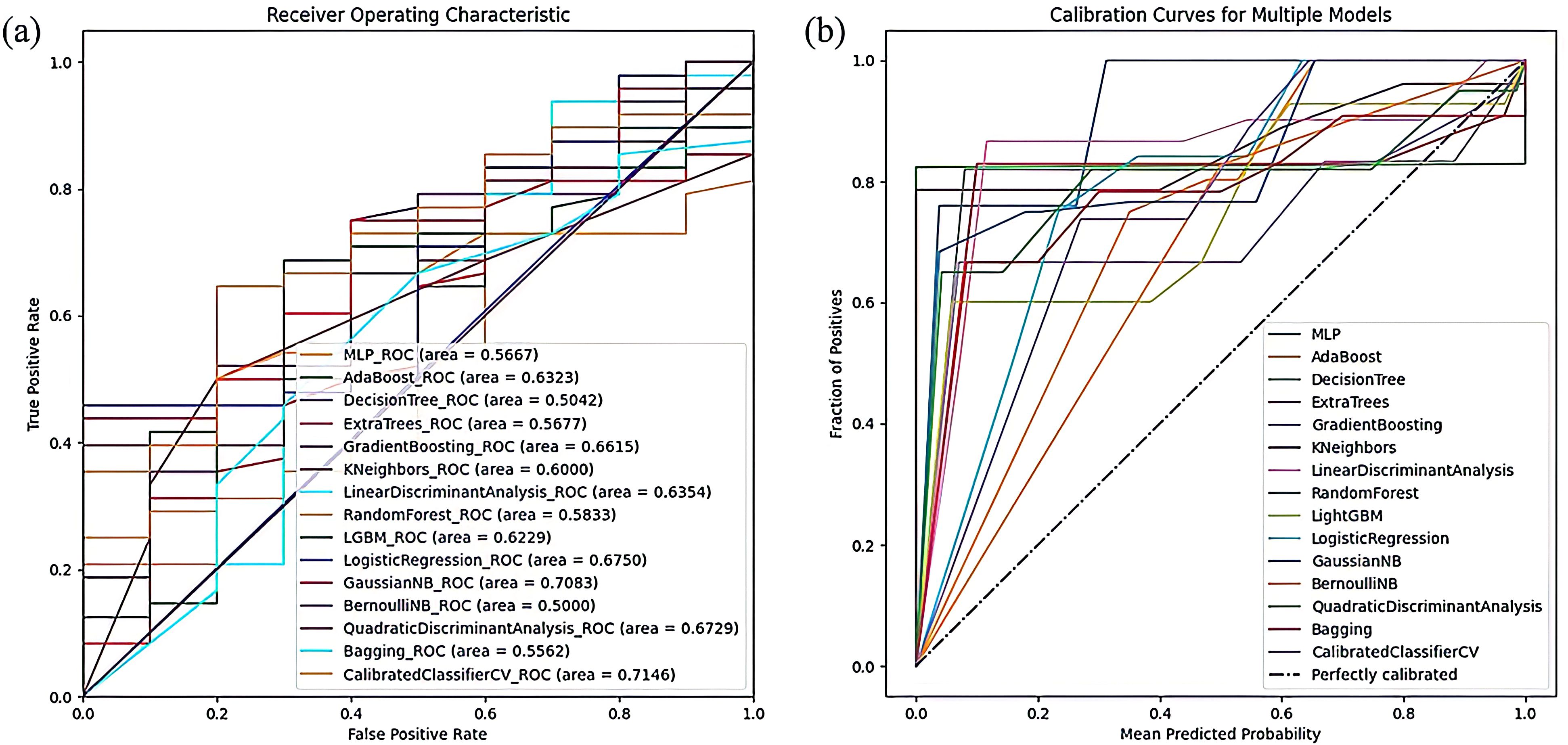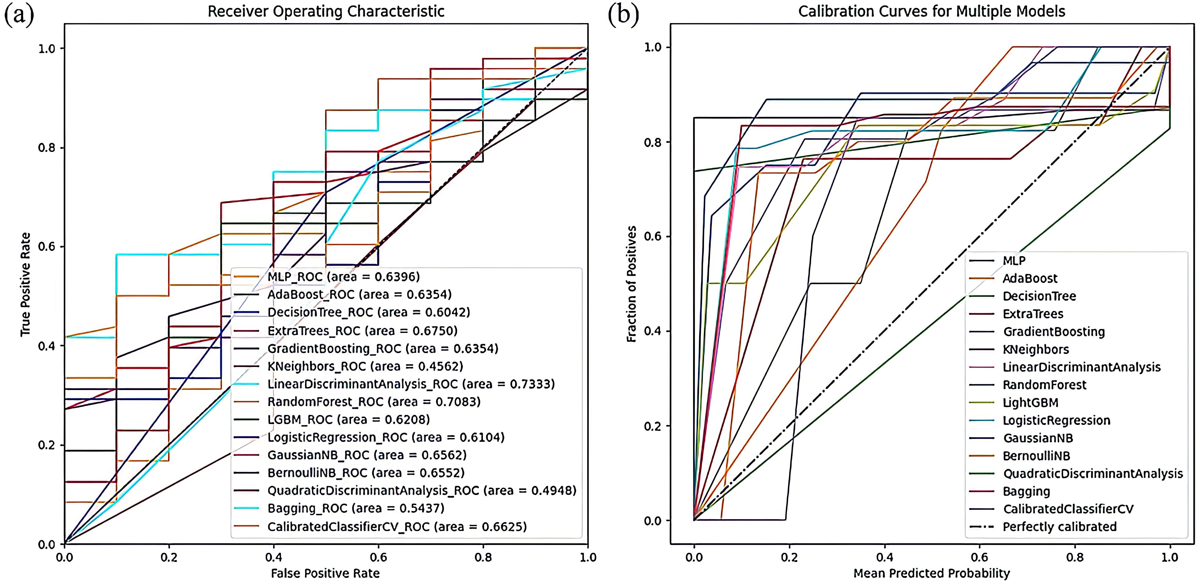 The Gradient Boosting classifier showed the highest accuracy among the evaluated models, achieving an average ACC of 72.41% and an AUC of 66.15%. In contrast, the Calibrated Classifier model recorded the lowest misdiagnosis rate, with ACC, PRE, and AUC values of 65.52%, 93.75%, and 71.46%, respectively. The ROC curves and Calibration curves of the radiomics models, depicted in Figure 5, reveal that the ROC curve of the Calibrated Classifier model is closest to the upper left corner, while its Calibration curve nears the ideal 45-degree line, demonstrating its outstanding clinical utility.