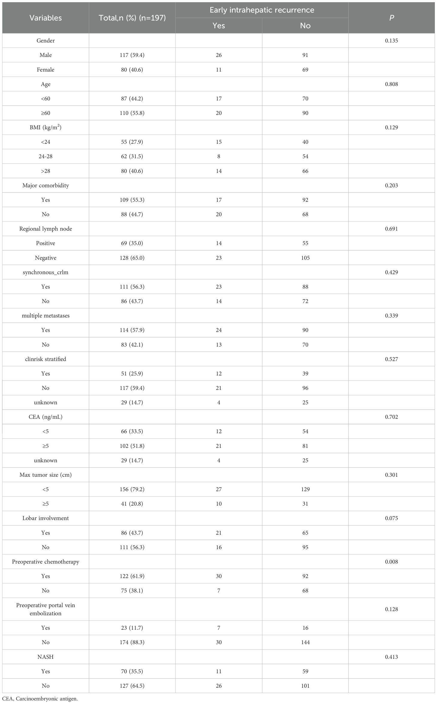 Colorectal cancer (CRC) ranks as the third most frequently diagnosed cancer, with more than 1.92 million newly diagnosed cases and 903,800 deaths worldwide in 2022 (1), and its high mortality rate is mainly attributed to metastasis (2, 3). The liver is the most common site of metastasis, accounting for approximately 50% of colorectal cancer metastases (4). Liver metastasis is one of the major causes of death for CRC with 6.9 months of median survival receiving only palliative care (5, 6). Despite decades of advances in systemic and local therapies, hepatectomy remains the only curative treatment for patients with resectable colorectal liver metastases (7, 8). However, around 30% patients experience intrahepatic recurrence within a year of post-hepatectomy (9), which have worse outcomes than that late recurrence (10, 11). Therefore, accurate predictive models for early recurrence risk in patients with colorectal liver metastases are of significant clinical value.