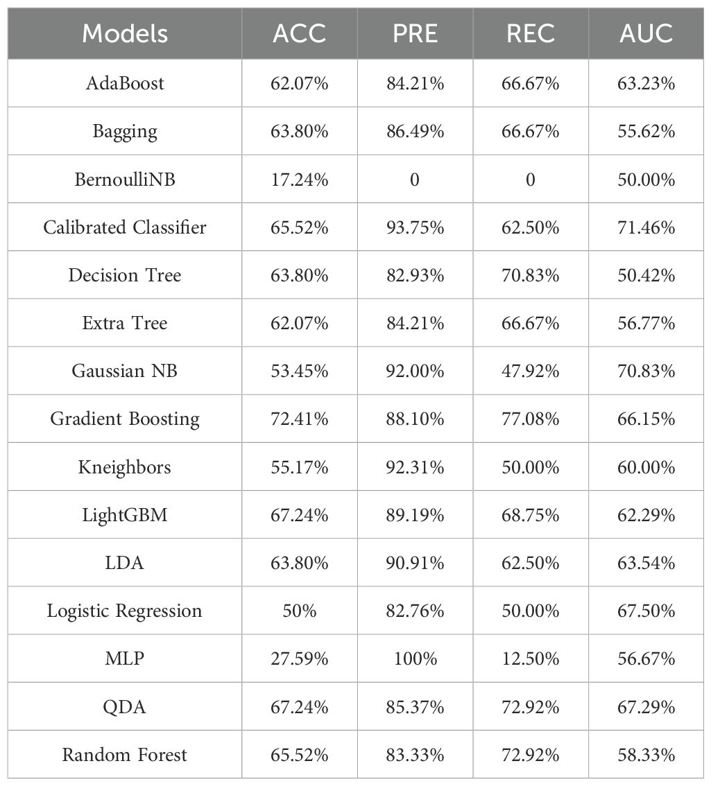 To utilize more comprehensive information for training models, we established a radiomics-clinical dataset for training machine learning models. This dataset significantly enhanced model performance compared to using solely radiomic features, as shown in Table 3.