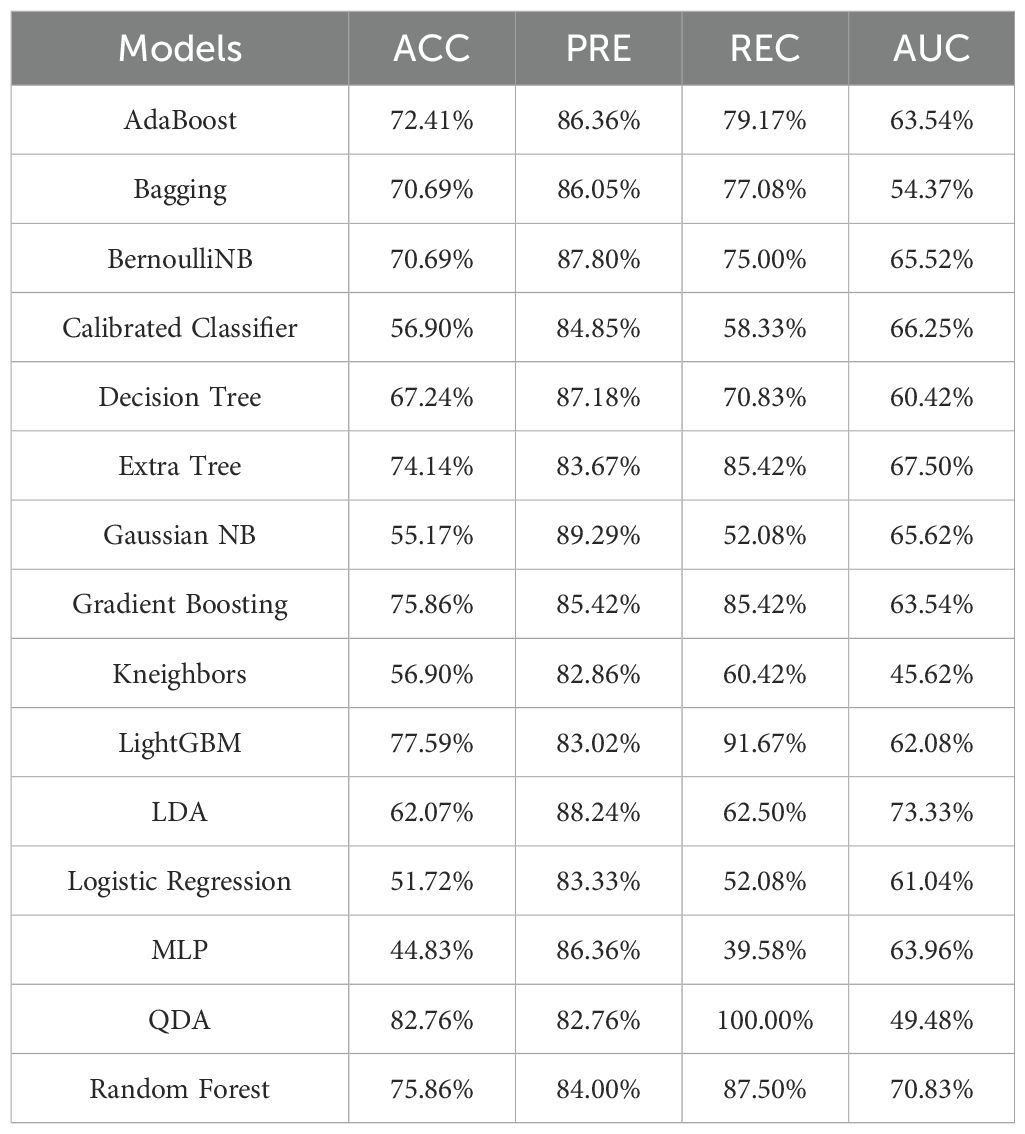 MLP is a feed-forward neural network used for both classification and regression problems. By learning complex patterns and features through multiple hidden layers (“multilayers”), MLP handles highly nonlinear prediction tasks and finds broad applications in image recognition, natural language processing, and more (27). QDA extends LDA by allowing different covariance matrices for each class, effectively managing cases with complex nonlinear boundaries between categories, particularly suitable for predictions where classes exhibit varying covariance structures (28).