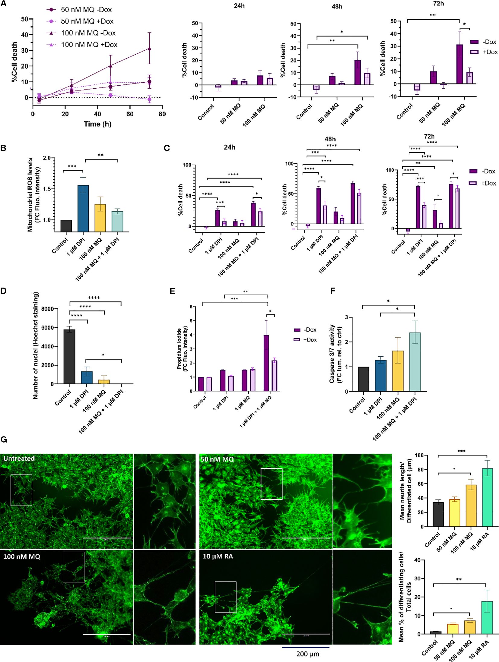 Figure 1. MitoQ induces cell death and differentiation and enhances DPI-induced cytotoxicity in MNA NB cells. (A) CellTox Green dye was used to determine cytotoxicity of IMR-5/75 cells -/+ Dox treated with MitoQ over a period of 72 hours. Bar charts (right) show detailed values and statistical significance at individual time points vs. control. +Dox: shRNA targeting MYCN induced and MYCN expression reduced; -Dox: shRNA targeting MYCN not induced. (B) MitoSOX Red dye was used to measure mitochondrial superoxide production in IMR-5/75 treated with DPI and MitoQ alone or in combination for 2 hours. (C) CellTox Green dye was used to determine cytotoxicity of IMR-5/75 cells -/+ Dox treated with DPI and MitoQ alone or in combination over a period of 72 hours. (D) Nuclei of IMR-5/75 cells were visualized by Hoechst staining after 72 hours of treatment with either DPI or MitoQ on their own or in combination. (E) Propidium Iodide staining was observed by confocal microscopy to quantify cell death in IMR-5/75 following a 24-hour treatment with 1 μM DPI, 1 μM DPI MitoQ or a combination of both in -Dox and +Dox cells. (F) Caspase-Glo 3/7 was used to determine caspases 3/7 activation in IMR-5/75 cells treated with DPI and MitoQ alone or in combination for 24 hours. (G) Neuronal differentiation was assessed by phalloidin staining of IMR-5/75 cells treated with 50 nM or 100 nM MitoQ for 7 days. 10 μM retinoic acid was used as a positive control to induce neurite outgrowth. Were taken into consideration cells with neurites >= 2 cell body diameters. Scale bar = 200 μm. (Mean ± SEM; n=3; Ordinary One-Way ANOVA or Two-Way ANOVA for -Dox/+Dox comparisons, p<0.05 = *, p<0.005 = **, p<0.0005 = ***, p<0.0001 = ****).