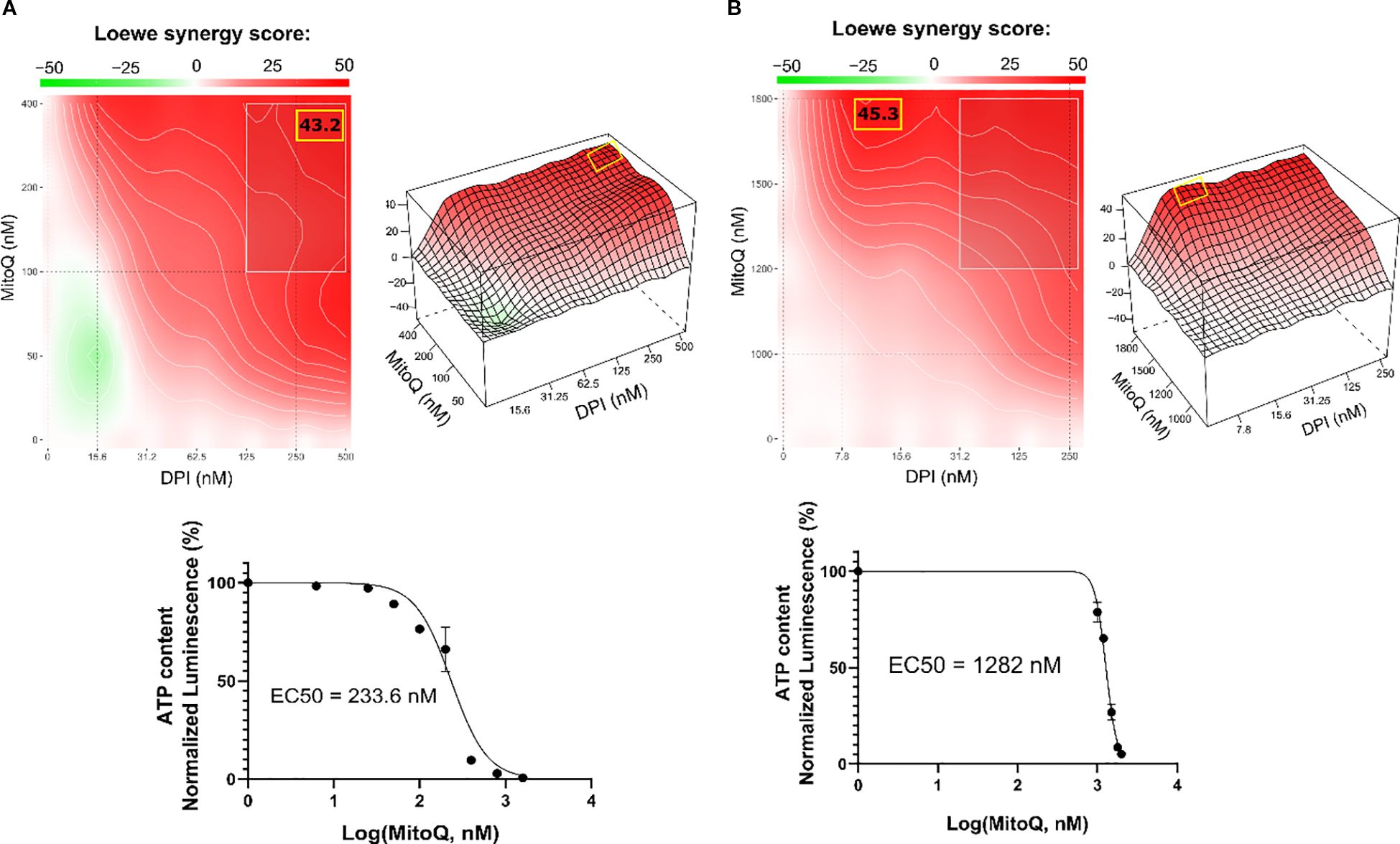 Heatmaps and 3D surface plots display Loewe synergy scores of MitoQ and DPI at different concentrations. Panel A shows scores peaking at 43.2, while Panel B scores up to 45.3. Below, graphs show ATP content versus MitoQ concentration, with EC50 values of 233.6 nanomolar and 1282 nanomolar, respectively.