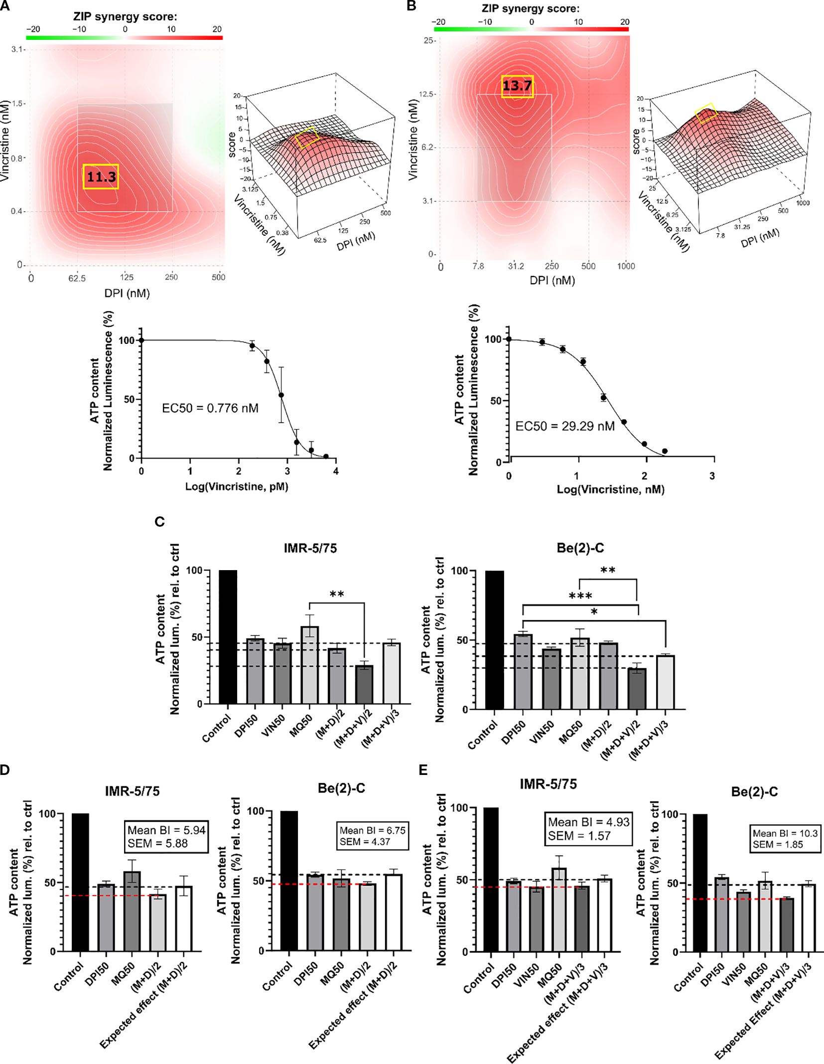 Composite image with various data visualizations analyzing synergy scores and ATP content. Panels A and B display contour and 3D surface plots showing ZIP synergy scores of 11.3 and 13.7 for Vincristine and DPI combinations at various concentrations. Below, graphs plot ATP content normalized luminescence against Log(Vincristine concentration), indicating effective concentrations (EC50) of 0.776 nM and 29.29 nM. Panel C compares ATP content in IMR-5/75 and Be(2)-C cell lines under different conditions, indicating significant differences. Panels D and E depict bar graphs with IMR-5/75 and Be(2)-C cell lines showing mean BI and SEM values under various treatments.
