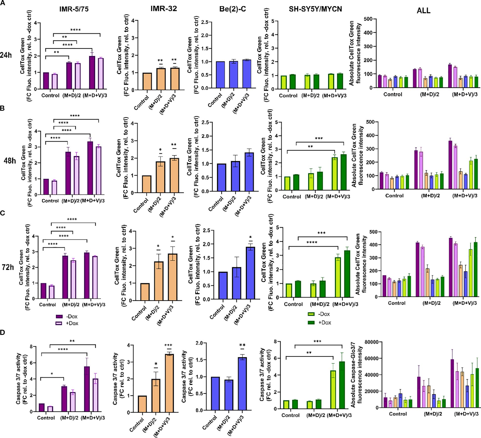 Figure 4. Double and triple combination therapy sensitizes HR-NB cells to cell death. (A-C) CellTox Green dye or (D) Caspase-Glo 3/7 was used to determine cytotoxicity and caspases 3/7 activation in IMR-5/75 cells -/+ Dox, IMR-32, Be(2)-C and SH-SY5Y/MYCN -/+ Dox with the double (M+D/2) or the triple (M+D+V/3) combination after (A) 24h, (B) 48h and (C) 72h of treatment. Caspases activation was measured at 24h. (Mean ± SEM; n=3; Ordinary One-Way ANOVA or Two-Way ANOVA for -/+ Dox cell lines, p<0.05 = *, p<0.005 = **, p<0.0005 = ***, p<0.0001 = ****). In the non-MYCN-amplified SH-SY5Y/MYCN cells, the expression of MYCN is doxycycline-inducible (+Dox: expression of the MYCN transgene induced; -Dox: MYCN transgene not induced).