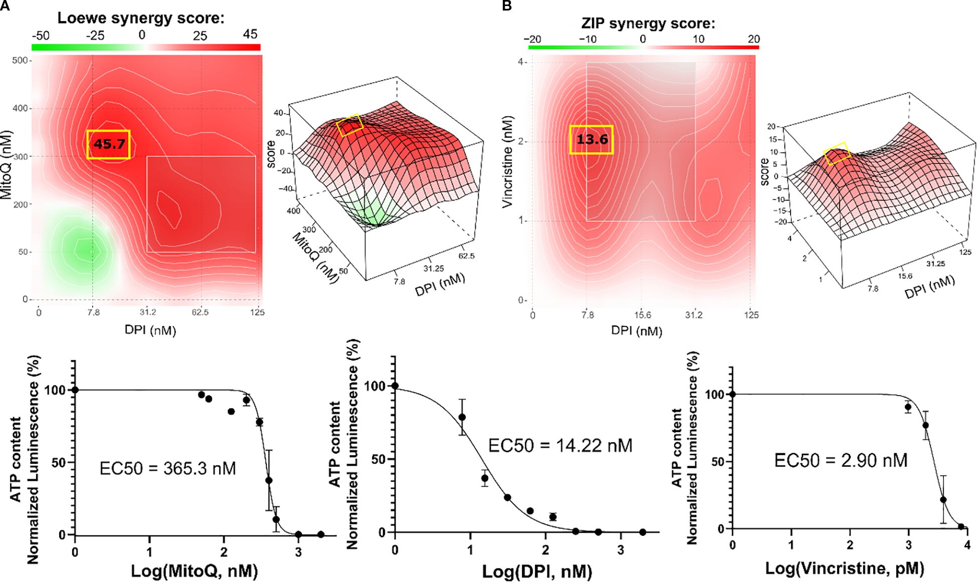 Panel A shows a contour plot and 3D graph representing the Loewe synergy score for MitoQ and DPI, with a maximum score of 45.7 highlighted. Below, a dose-response curve indicates the EC50 for MitoQ as 365.3 nM. Panel B presents the ZIP synergy score plot and 3D graph for Vincristine and DPI, with a highlighted score of 13.6. Below, dose-response curves reveal EC50 values for DPI and Vincristine as 14.22 nM and 2.90 nM, respectively.
