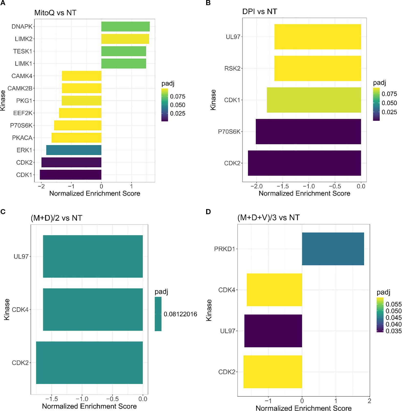 Figure 6. Kinase enrichment analysis of single and combined drug effects. Kinase enrichment inferred from phosphoproteomic data from (A) MitoQ IC50 vs control, and (B) DPI IC50 vs control, (C) (M+D)/2 vs control, and (D) (M+D+V)/3 vs control, after 24 hours of treatment. (Mean ± SEM; n=3; FDR = 0.05, s0 = 0.1).