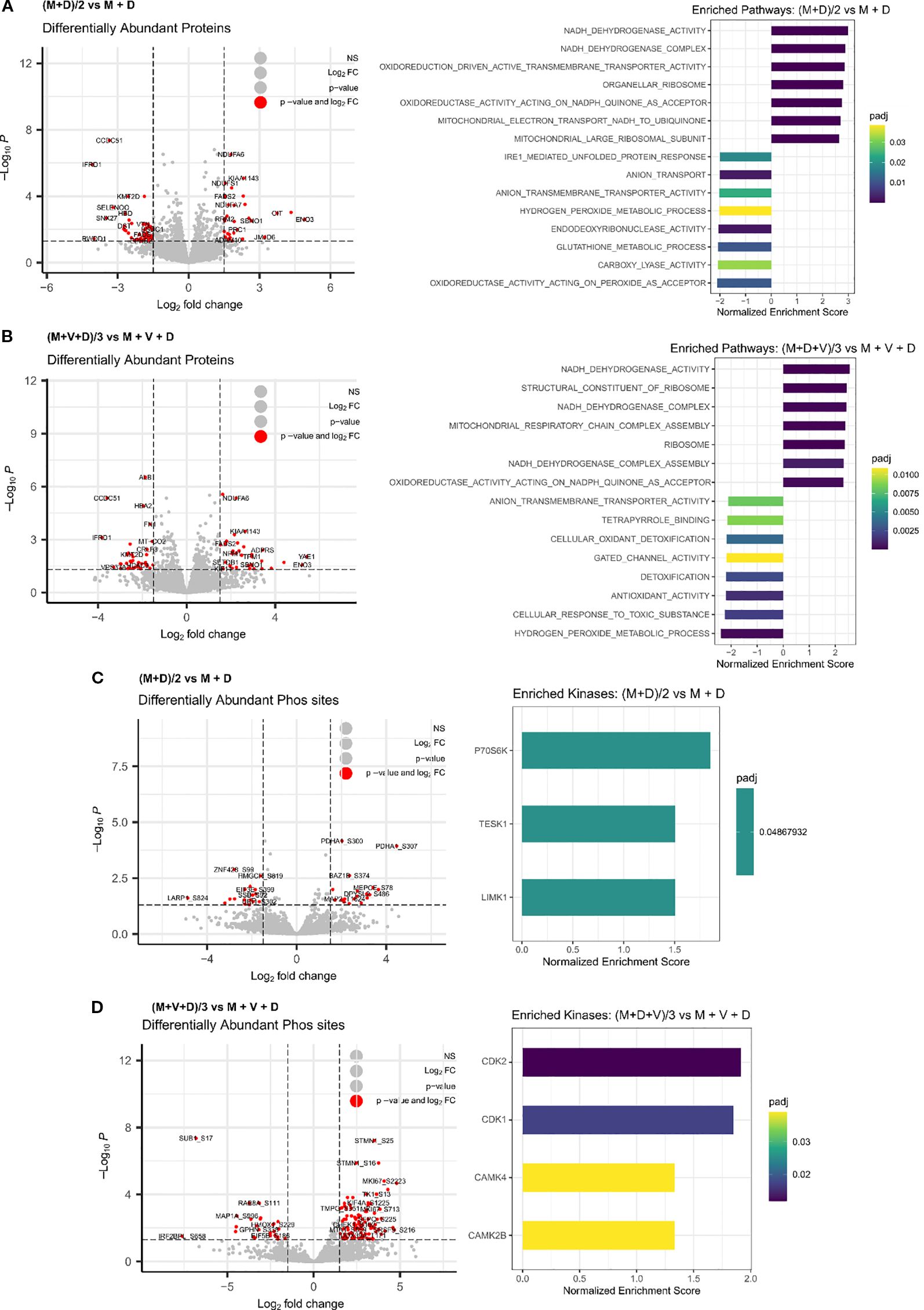 Volcano plots and bar charts illustrate differentially abundant proteins and phosphosites with enriched pathways and kinases. Panels A and B show log fold changes and significance of proteins for (M+D)/2 vs M+D and (M+V+D)/3 vs M+V+D comparisons. Panels C and D depict phosphosites for the same comparisons. Color-coded pathways and kinase enrichment scores are shown on the right, indicating statistical significance with adjusted p-values.