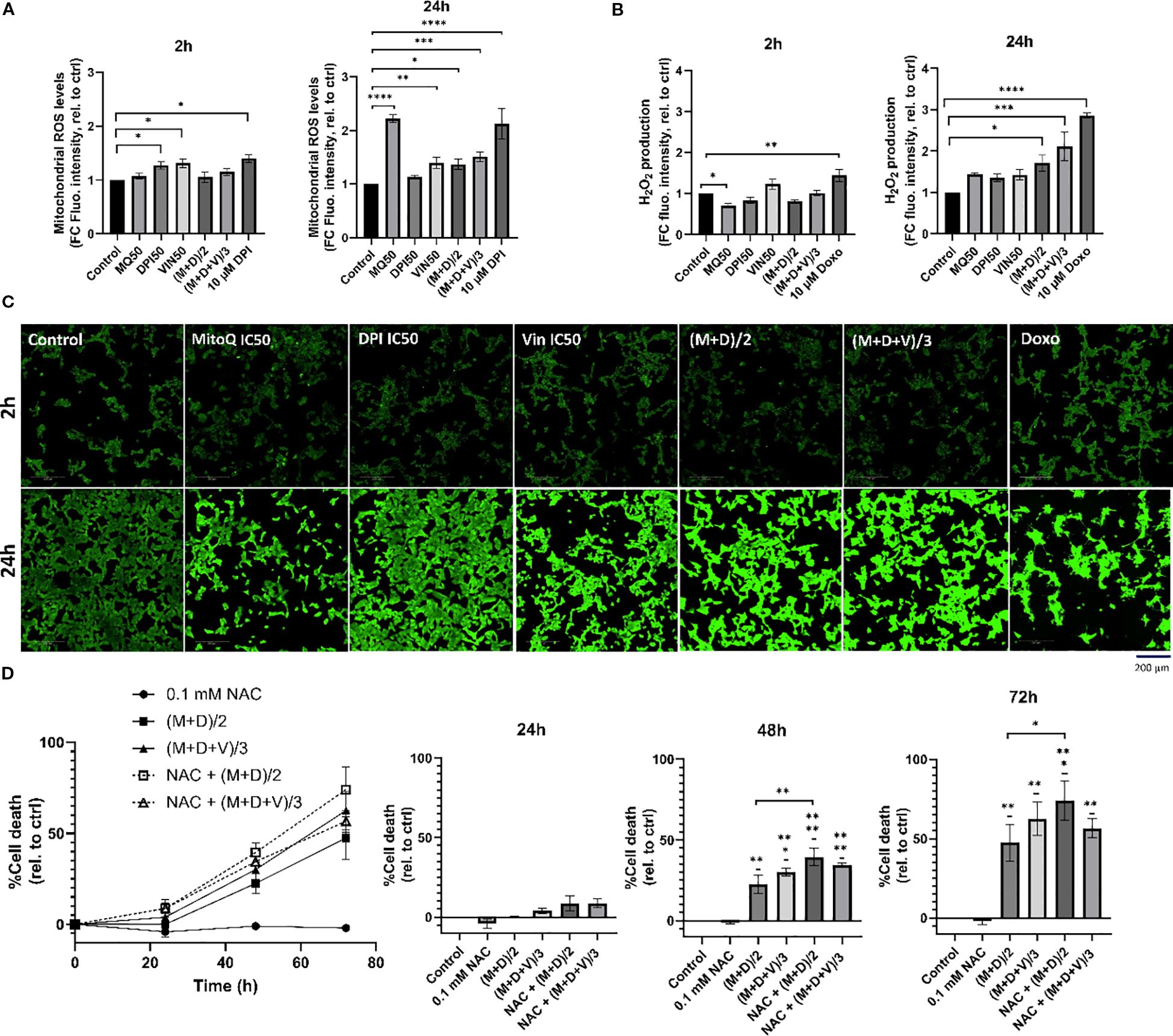Bar charts, fluorescence microscopy images, and line graphs illustrating mitochondrial ROS levels, H2O2 production, and cell death percentage across control and treatment groups over time. Bar charts (A, B) display data at 2 and 24 hours, highlighting significant changes. Fluorescence images (C) show mitochondrial activity at 2 and 24 hours across different treatments. Line and bar graphs (D) depict cell death percentages at 24, 48, and 72 hours with statistical significance indicated. Scale bar in images represents 200 micrometers.