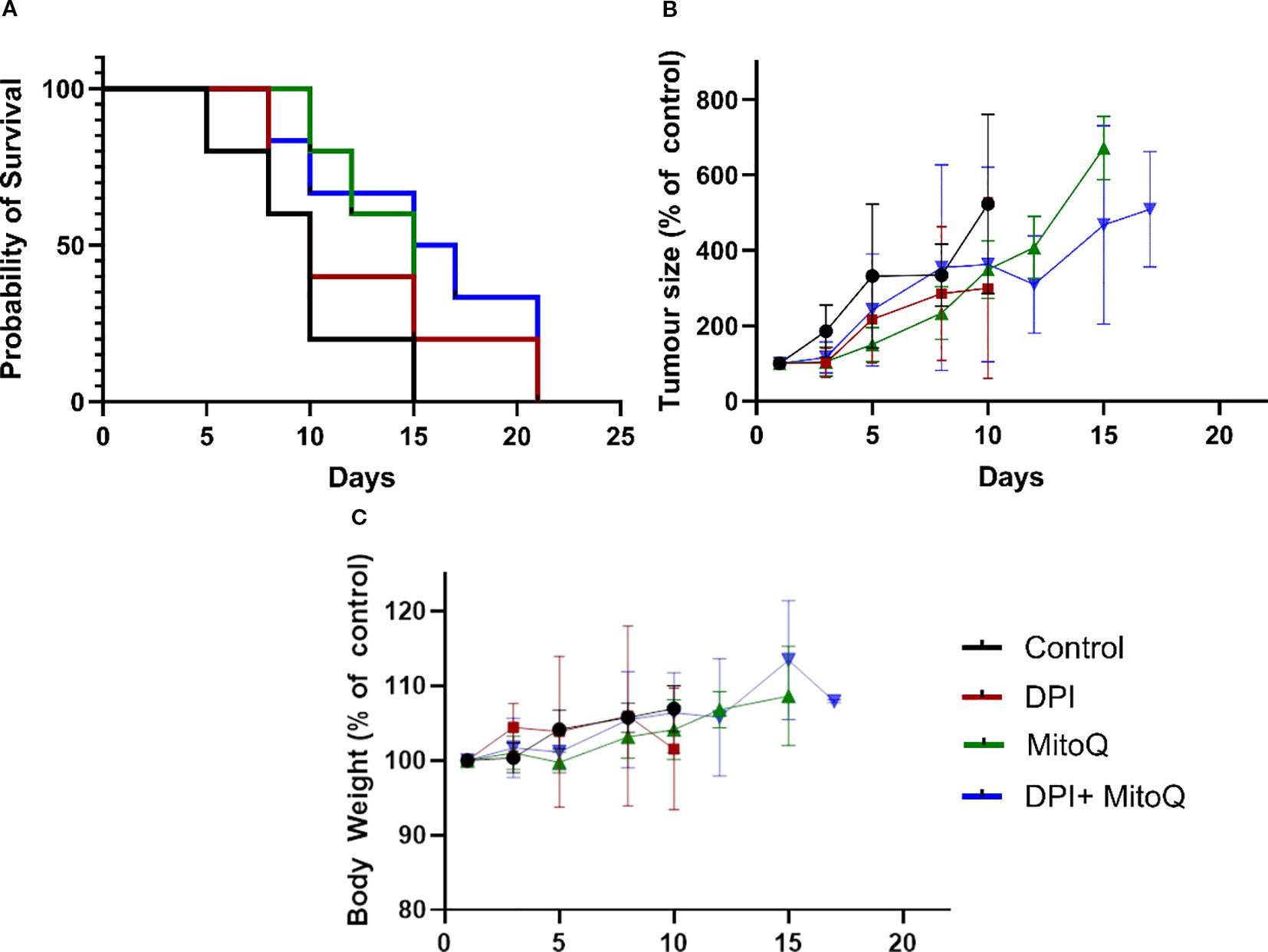 Kaplan-Meier survival curve, tumor growth, and body weight analysis in a study with control, DPI, MitoQ, and DPI+MitoQ groups. Panel A shows survival probability over 22 days, indicating varying survival rates among groups. Panel B depicts tumor size as a percentage of control over time, with error bars. Panel C shows body weight percentages with error bars, remaining relatively stable among groups. The legend identifies each treatment group by color.