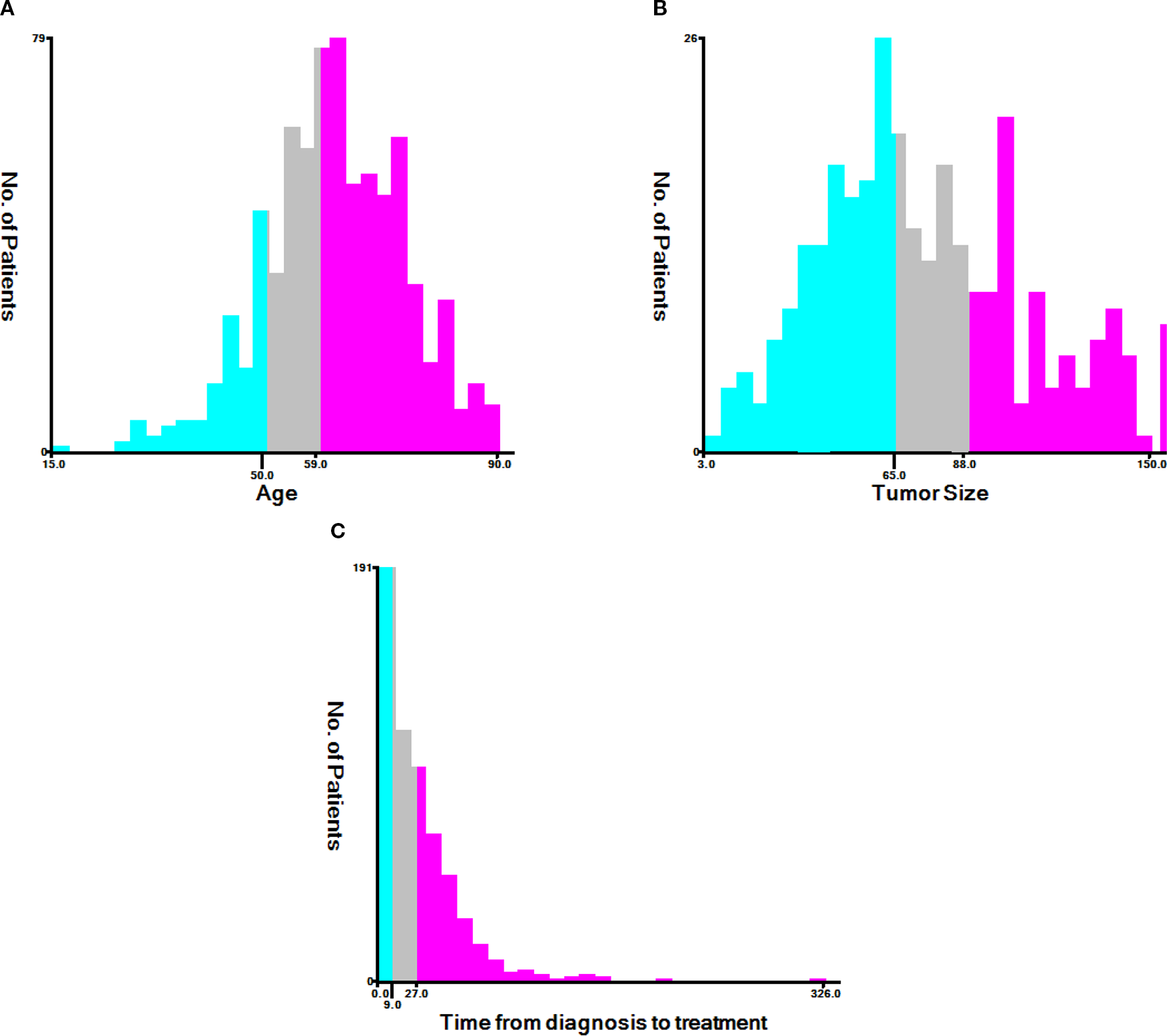 According to X-tile, the optimal cutoff values for age were 50 years old and 59 years old. Patients were categorized into groups of ≤50, 51–59, and ≥60 years old (Figure 2A). The optimal cutoff values for tumor size were identified as 65 mm and 88 mm, with patients grouped as ≤ 65 mm, 66–88 mm, and ≥ 89 mm (Figure 2B). Additionally, the optimal cutoff values for time from diagnosis to treatment were established at 9 days and 27 days, resulting in patient groupings of ≤9 days, 10–27 days, and ≥28 days (Figure 2C).
