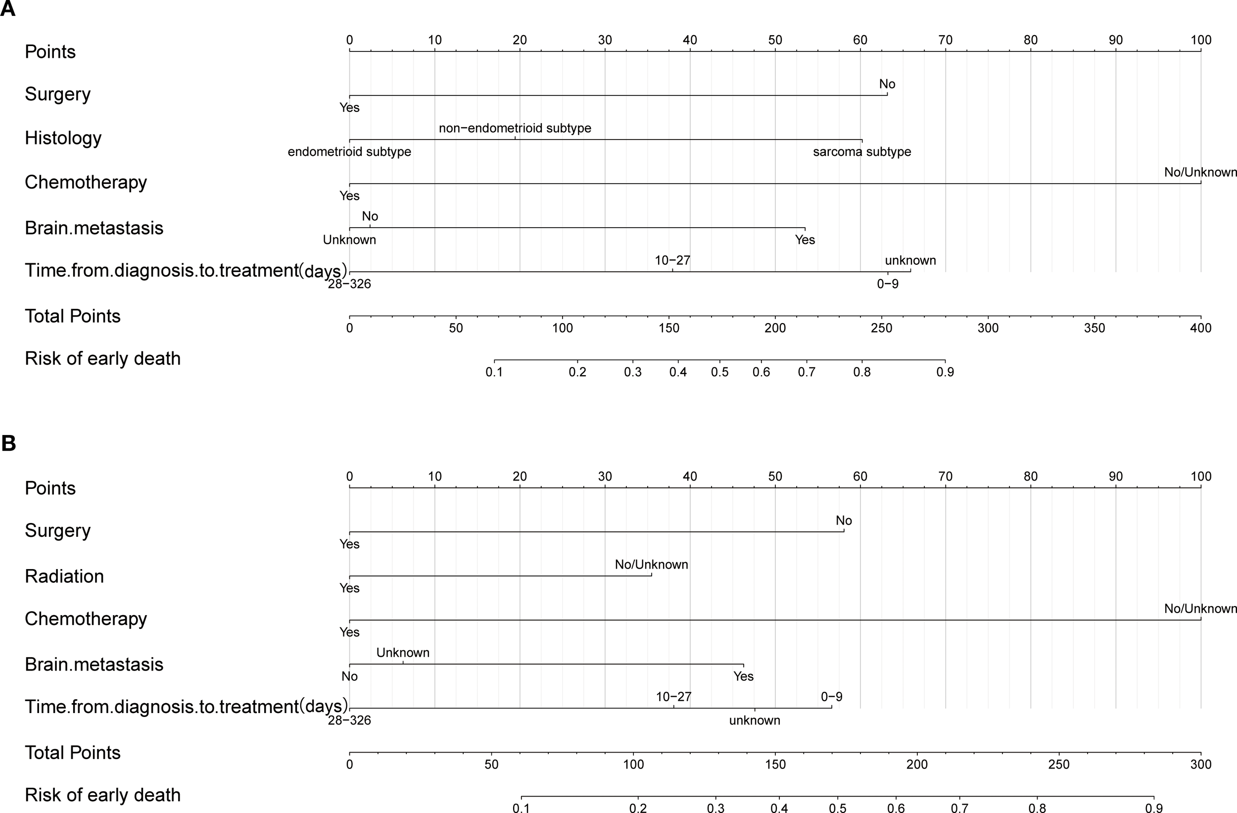 | Name | Levels | No (N=450) | Overall early death (N=319) | Cancer-specific early death (N=299) |