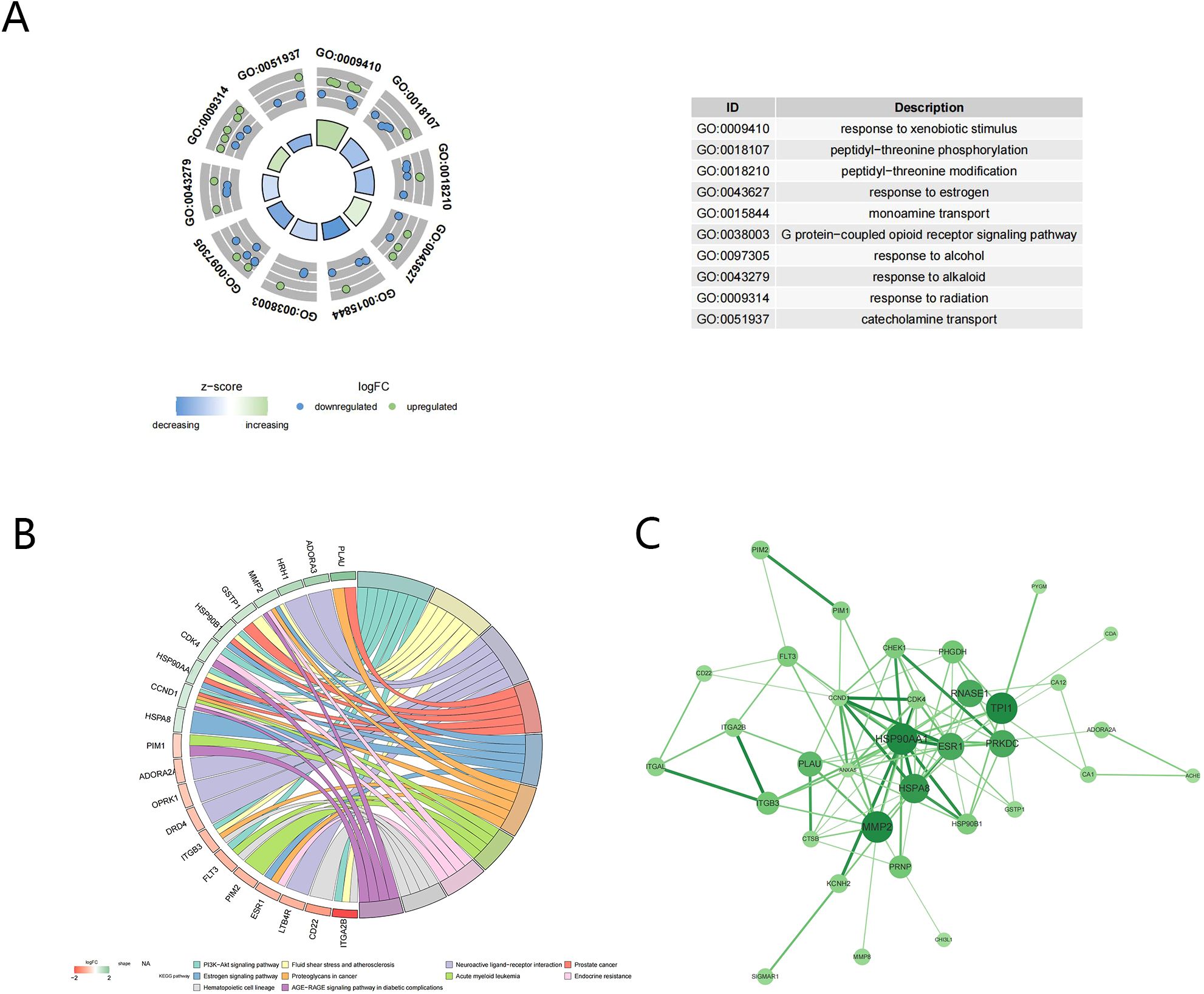 Figure 2. Function enrichment and PPI analysis of candidate targets. (A) GO enrichment analysis; (B) KEGG enrichment analysis; (C) Protein-protein interaction of candidate targets.