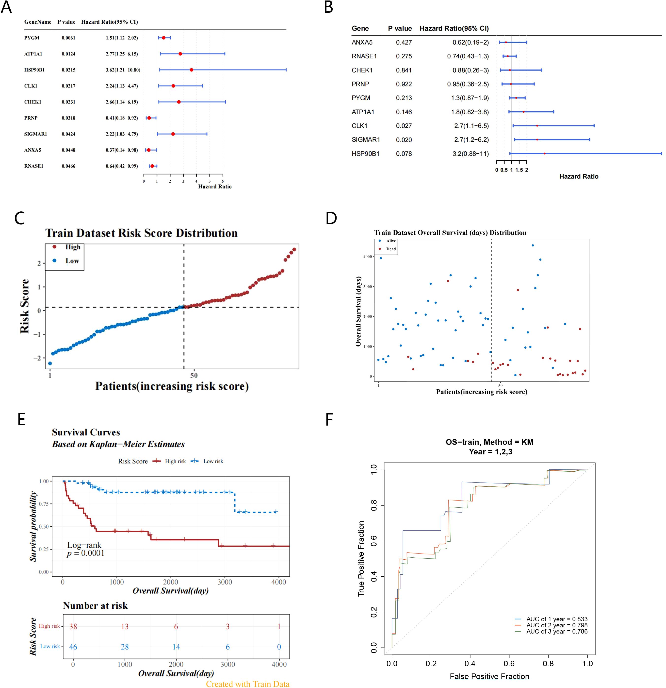 Figure 3. Identification of key targets and construction of prognostic model. (A, B) Forest plots demonstrate the acquisition of 9 candidate genes by univariate COX regression analysis and multivariate COX regression analysis based on 37 candidate genes; (C) Train dataset risk score distribution based on 5-targets risk scoring model(high-risk: 38 samples, low-risk: 46 samples); (D) The survival status distribution map of the high and low risk groups shows that the higher the risk score, the shorter the survival time; (E) The training set K-M curve indicate low survival in the high-risk group; (F) The ROC curve in the training set (AUC greater than 0.7) suggests that the prognostic model has good predictive performance.