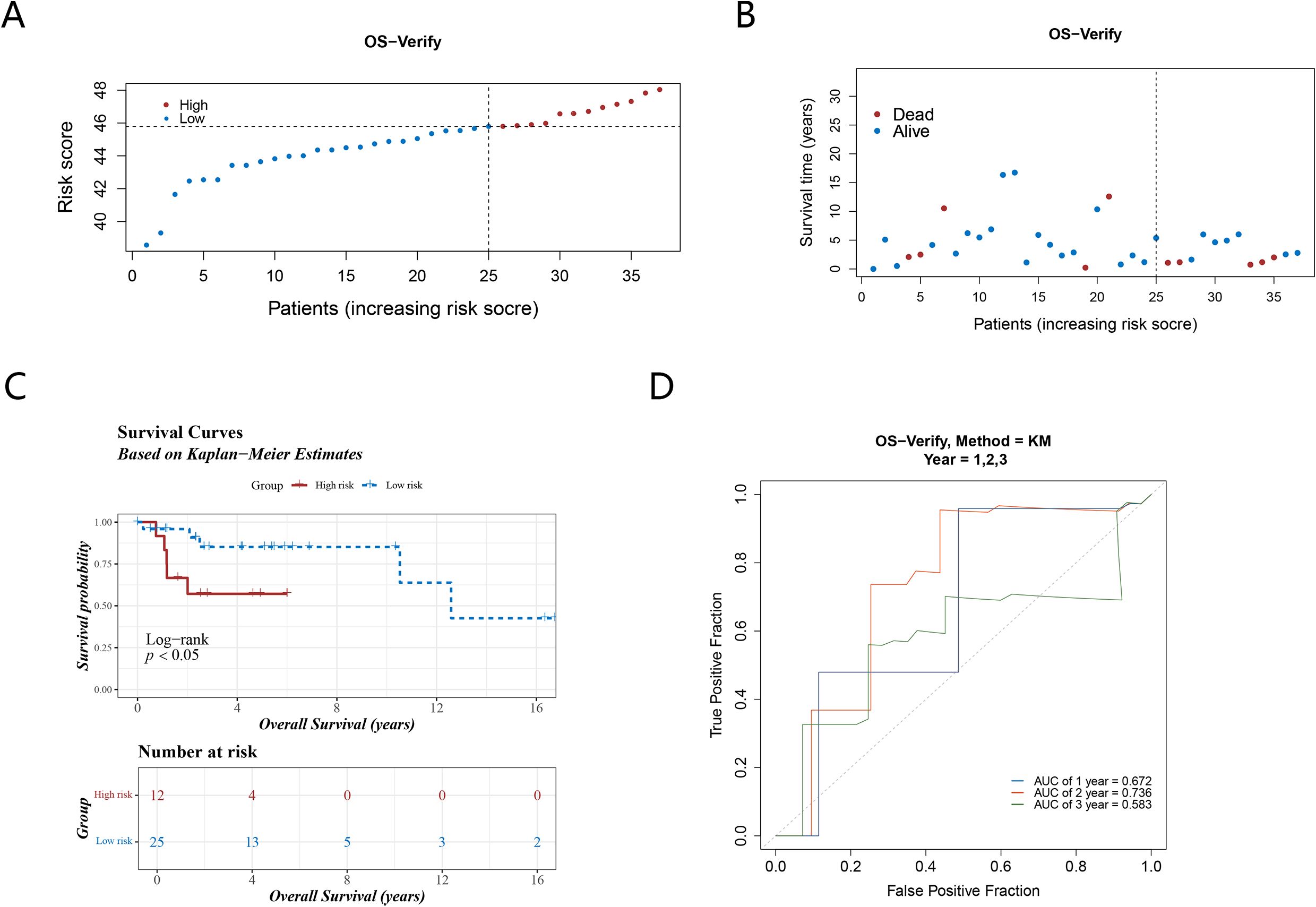 Figure 4. The validation set verifies the reliability of the prognostic model. (A) Risk score distribution of the high and low risk groups; (B) The survival status distribution of validation set; (C, D) The validation set K-M curves and ROC curves illustrate the robust performance of the prognostic model.