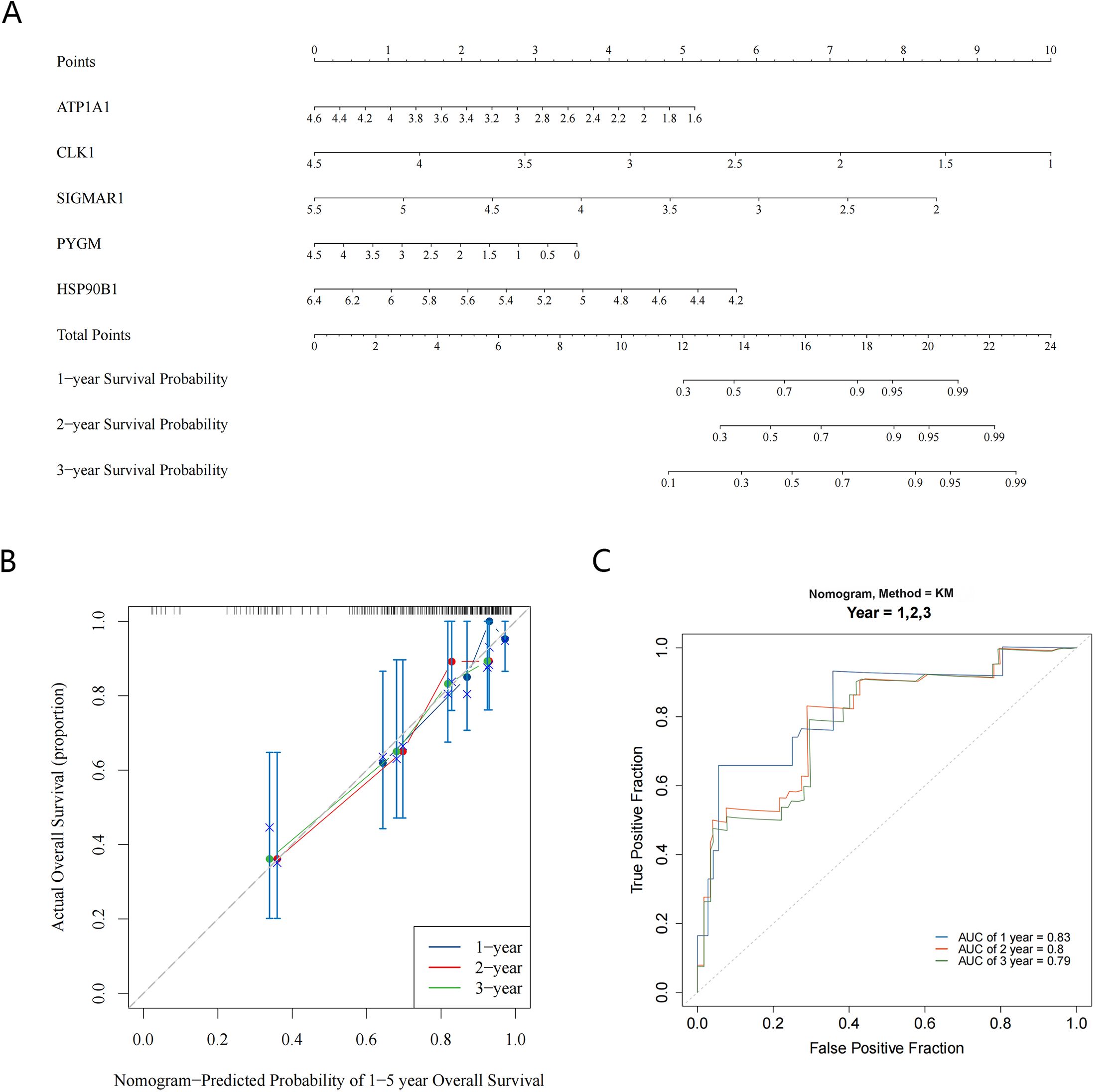 Meanwhile, the results of the Nomogram showed that CLK1 had the greatest contribution to patient survival, followed by SIGMAR1, HSP90B1, ATP1A1, and PYGM (Figure 5A). The calibration curve showed that the slopes of the nomogram-predicted survival probabilities for different years were close to 1 (Figure 5B). Furthermore, the AUC values were all greater than 0.7 (1-, 2-, and 3-year) (Figure 5C), indicating that the nomogram had good predictive performance.