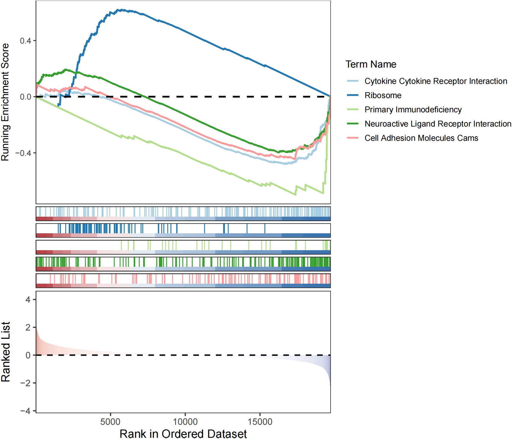Subsequent GSEA analysis identified 34 pathways that showed significant differences between the 2 groups (adj.p <0.05), such as ribosome (Figure 6). These functions still require further investigation.