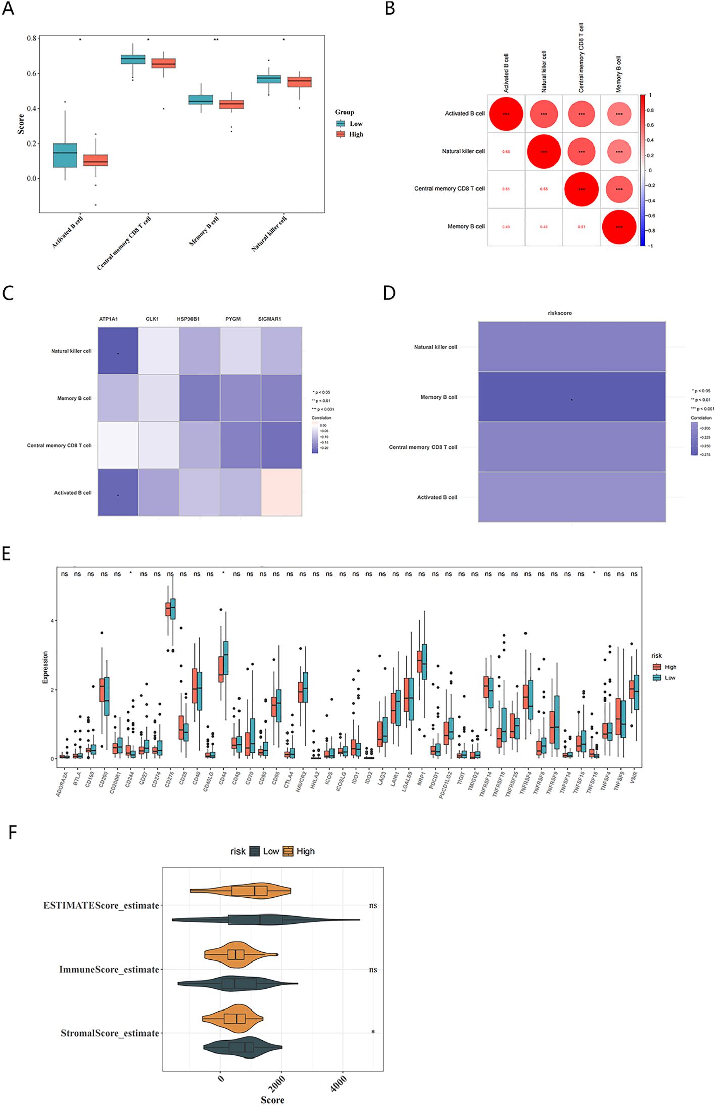 Subsequently, the Wilcoxon test indicated that activated B cells, memory B cells, natural killer cells, and central memory CD8 T cells in the high-risk group were all significantly less abundant than those in the low-risk group (P <0.05) (Figure 7A). The correlation analysis between key targets and different immune cells showed that ATP1A1 was weakly negatively correlated with natural killer cells and activated B cells (|cor| < 0.3, P <0.05) (Figure 7B). ATP1A1 was then weakly negatively correlated with activated B cells and natural killer cells (|cor| < 0.3, P <0.05) (Figure 7C). The correlation analysis between the risk scores and different immune cells showed that only memory B cells were weakly negatively related to risk scores (|cor| < 0.3, P <0.05) (Figure 7D). Simultaneously, in the high-risk group the immune checkpoints CD244 and TNFSF18 were significantly overexpressed, while CD44 was significantly underexpressed (Figure 7E). Additionally, stromal score of the high-risk group was significantly lower (Figure 7F).