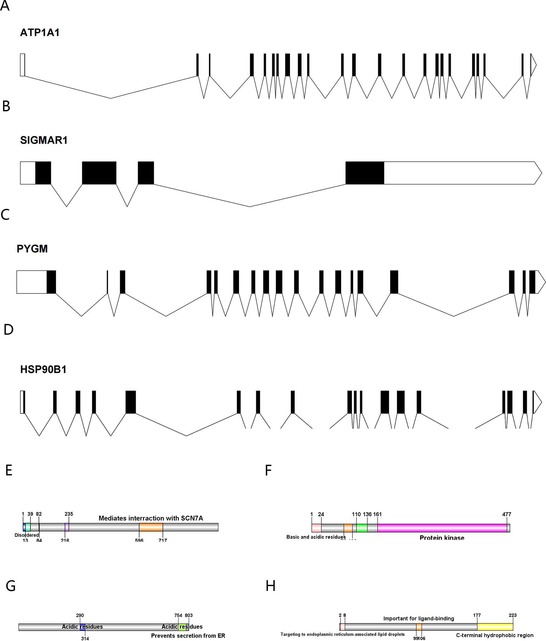Figure 8. (A–D) The exon-intron structures of ATP1A1, SIGMAR1, PYGM, and HSP90B1 (exons are indicated by black rectangles, 5′UTR and 3′UTR by white rectangles, and introns by lines); (E–H) The protein structures of ATP1A1, CLK1,HSP90B1, and SIGMAR1 (Color represents structural domains).