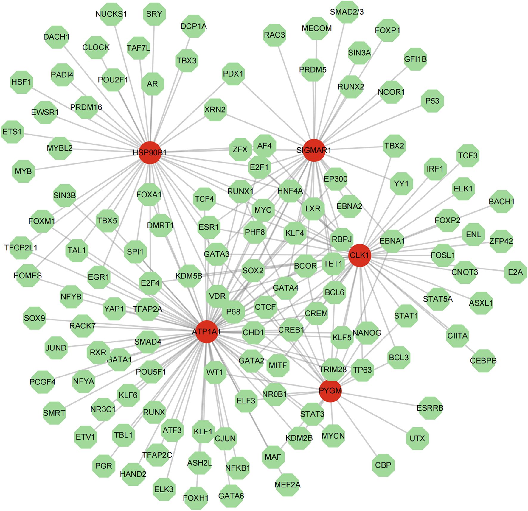 The TF-mRNA network contained 136 nodes and 214 edges. ATP1A1, CLK1, SIGMAR1, PYGM, and HSP90B1 were predicted to have 78, 42, 33, 22, and 38 transcription factors, respectively. Among them, transcription factors such as GATA3 were found to co-regulate these 5 key targets (Figure 9).