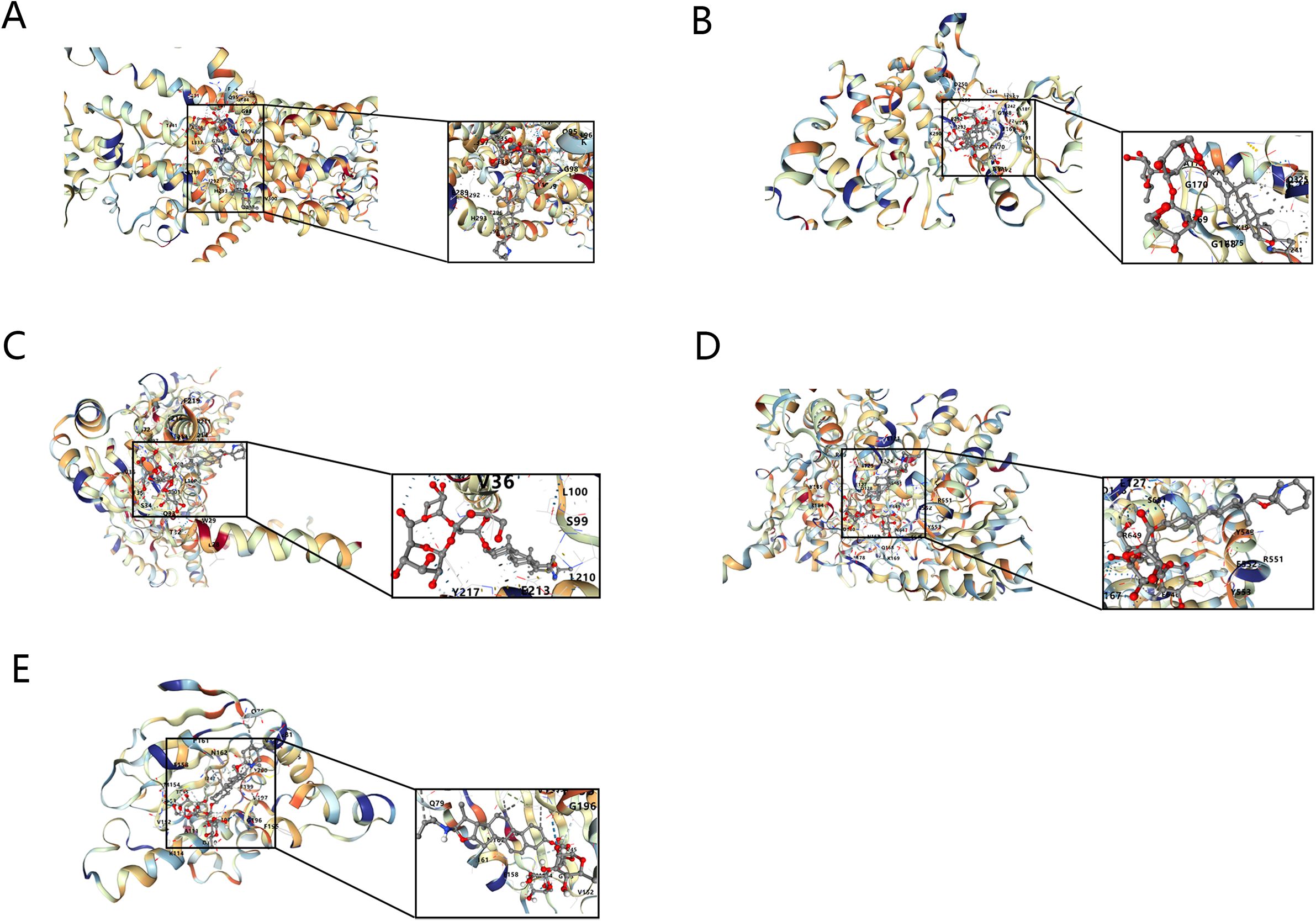 Figure 10. Molecular docking diagrams of Solasonine with ATP1A1 (A), CLK1 (B), SIGMAR1 (C), PYGM (D), and HSP90B1 (E).