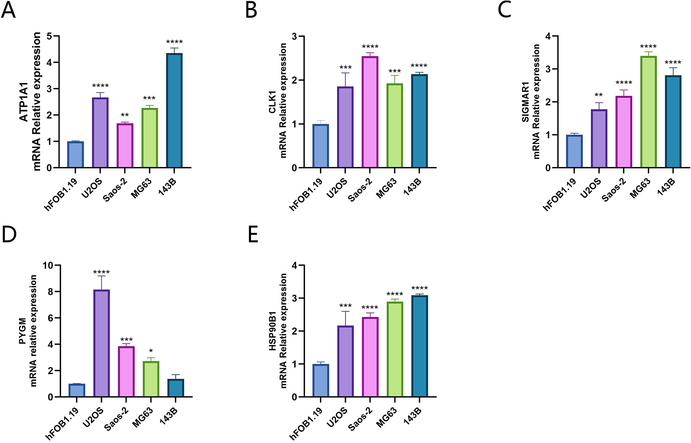 Figure 11. Expression of key targets in osteosarcoma cell lines (A) ATP1A1; (B) CLK1; (C) SIGMAR1; (D) PYGM; (E) HSP90B1). *p < 0.05, **p < 0.01, ***P< 0.001, ****P < 0.0001.