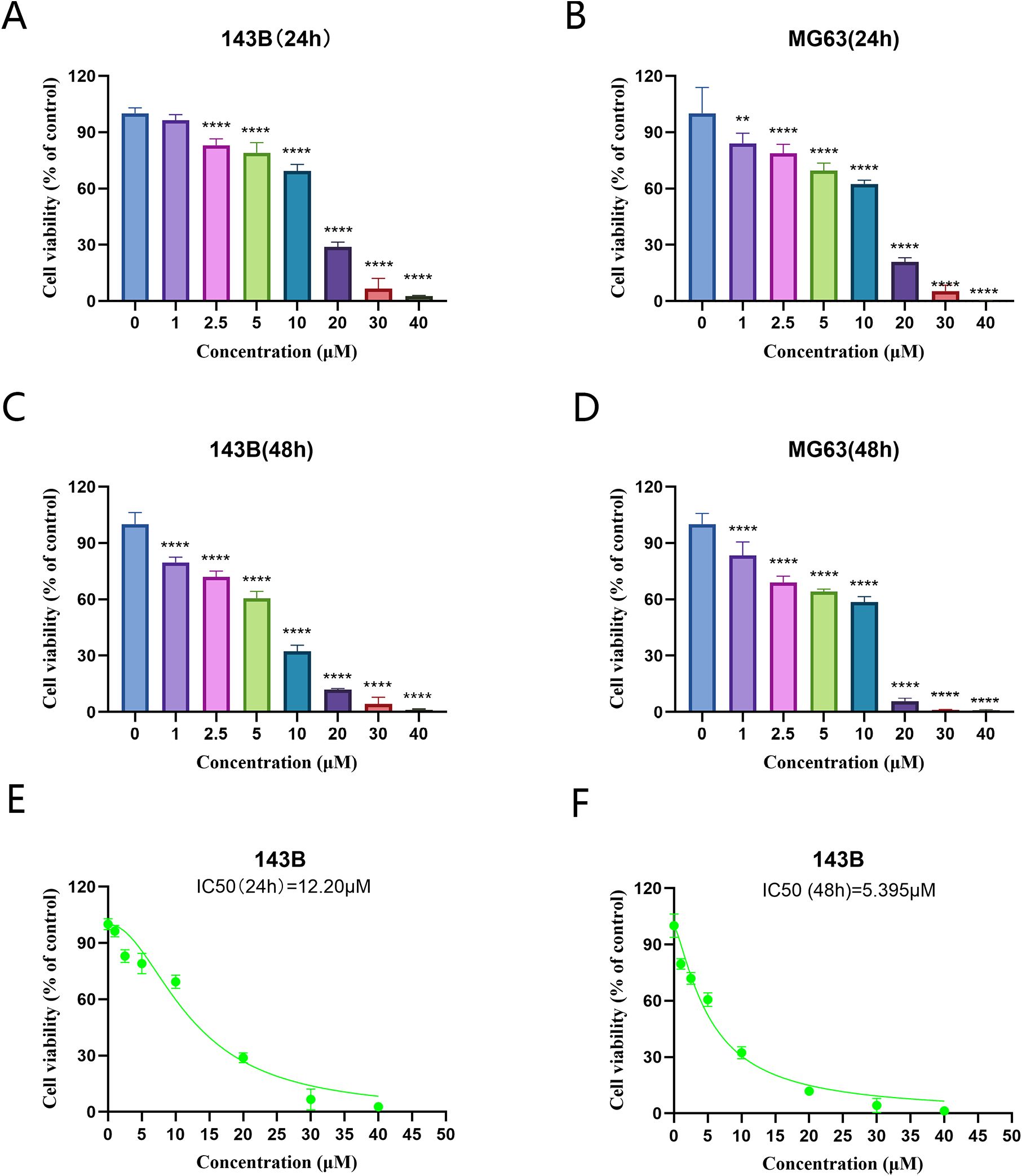 Figure 12. Solasonine inhibited the cell viability in OS cells.143 B (A, C), and MG63 (B, D) cells were treated with serial concentrations of SS, and the effects of solasonine on cell viability were measured by cell counting Kit-8 assay at 24 and 48h. **P < 0.01; ****P < 0.0001, vs control. (E, F) Viability change curves of 143B cells treated with different concentrations of solasonine.