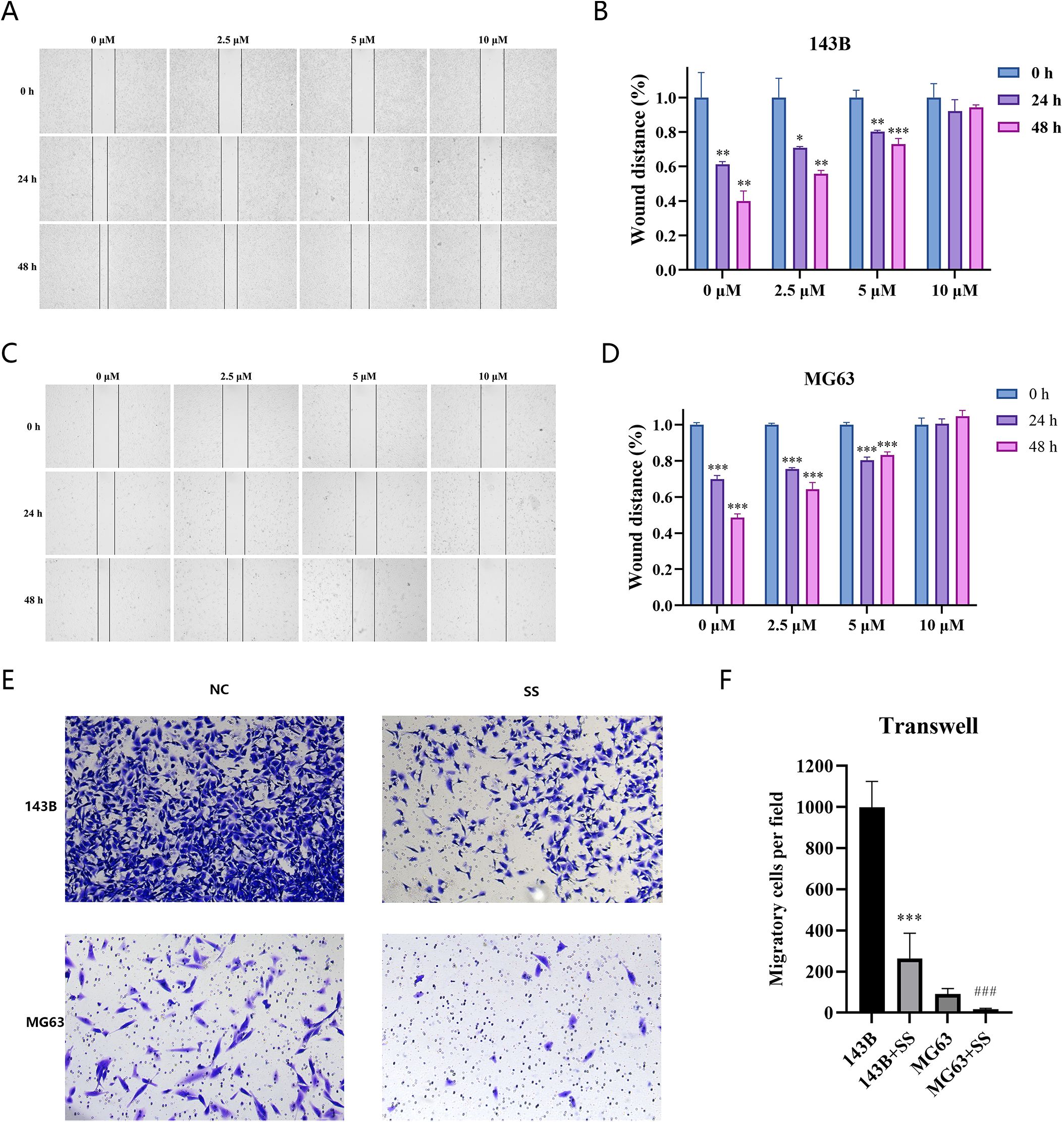 Figure 13. (A–D) wound-healing migration of SS-treated 143B (A, C), MG63 (B, D) cells and the quantitative assays were examined. (E, F) transwell invasion of the SS-treated cell lines and the quantitative assays were examined (***P<0.0001, ###P<0.0001).