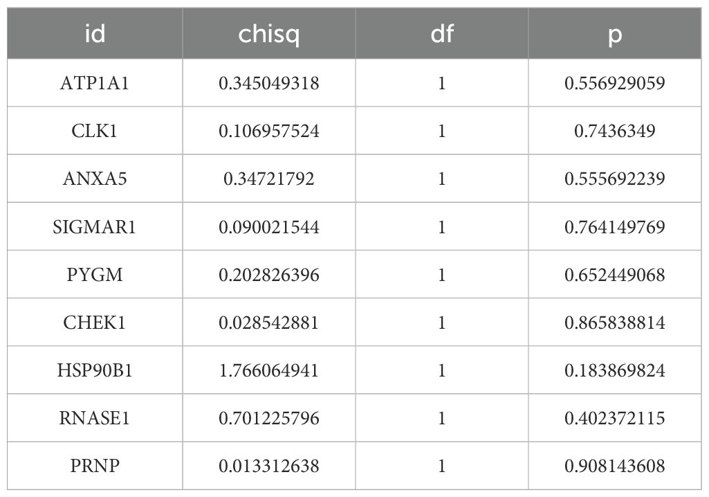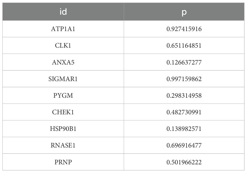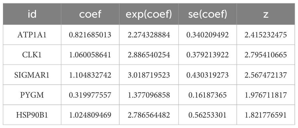 9 survival-related genes were identified after univariate and multivariate Cox regression analyses, and PH assumption tests (P > 0.05) were conducted separately for the regression analysis results (Figures 3A, B) (Tables 1, 2). Then, through stepwise regression analysis, 5 key targets (ATP1A1, CLK1, SIGMAR1, PYGM, HSP90B1) were finally determined (Table 3).