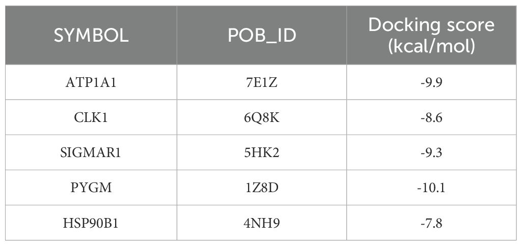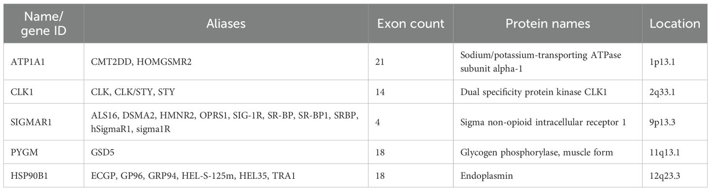 The full-length gene transcripts showed that ATP1A1 (Figure 8A), CLK1, SIGMAR1 (Figure 8B), PYGM (Figure 8C), and HSP90B1 (Figure 8D) contained 21, 14, 4, 18, and 18 exons, respectively. The full-length gene transcript of CLK1 included non-coding regions, making it impossible to visualize the gene structure of CLK1. The protein structures showed that all proteins contained domains characteristic of themselves (ATP1A1: sodium/potassium-transporting ATPase subunit alpha-1; CLK1: dual specificity protein kinase CLK1; SIGMAR1: sigma non-opioid intracellular receptor 1; PYGM: glycogen phosphorylase, muscle form; HSP90B1: Endoplasmin) (Figures 8E–H). Among them, the PYGM gene had no domain information in the Uniprot database, making it impossible to visualize. The gene and protein information of the key targets were summarized (Table 4).