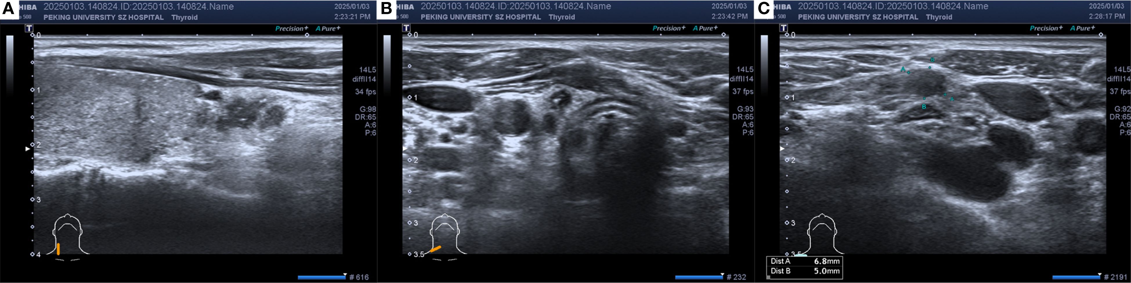 Figure 1. The thyroid ultrasound in December 2024: (A) Hypoechoic thyroid nodule located in the right thyroid lobe. (B) Enlarged lymph node in the central neck region (Level VI). (C) Enlarged lymph node in the right supraclavicular region. Heterogeneous echogenicity in the right thyroid lobe, with multiple scattered punctate hyperechoic foci. A hypoechoic nodule measuring approximately 13×4×8 mm with an irregular shape and punctate hyperechoic foci inside was observed in the lower part of the right lobe. Multiple hypoechoic nodules with irregular shapes, clear boundaries, cortical thickening, and loss of the lymph node hilum structure were found from level IV of the right neck to the right supraclavicular region, with a few hyperechoic foci inside.